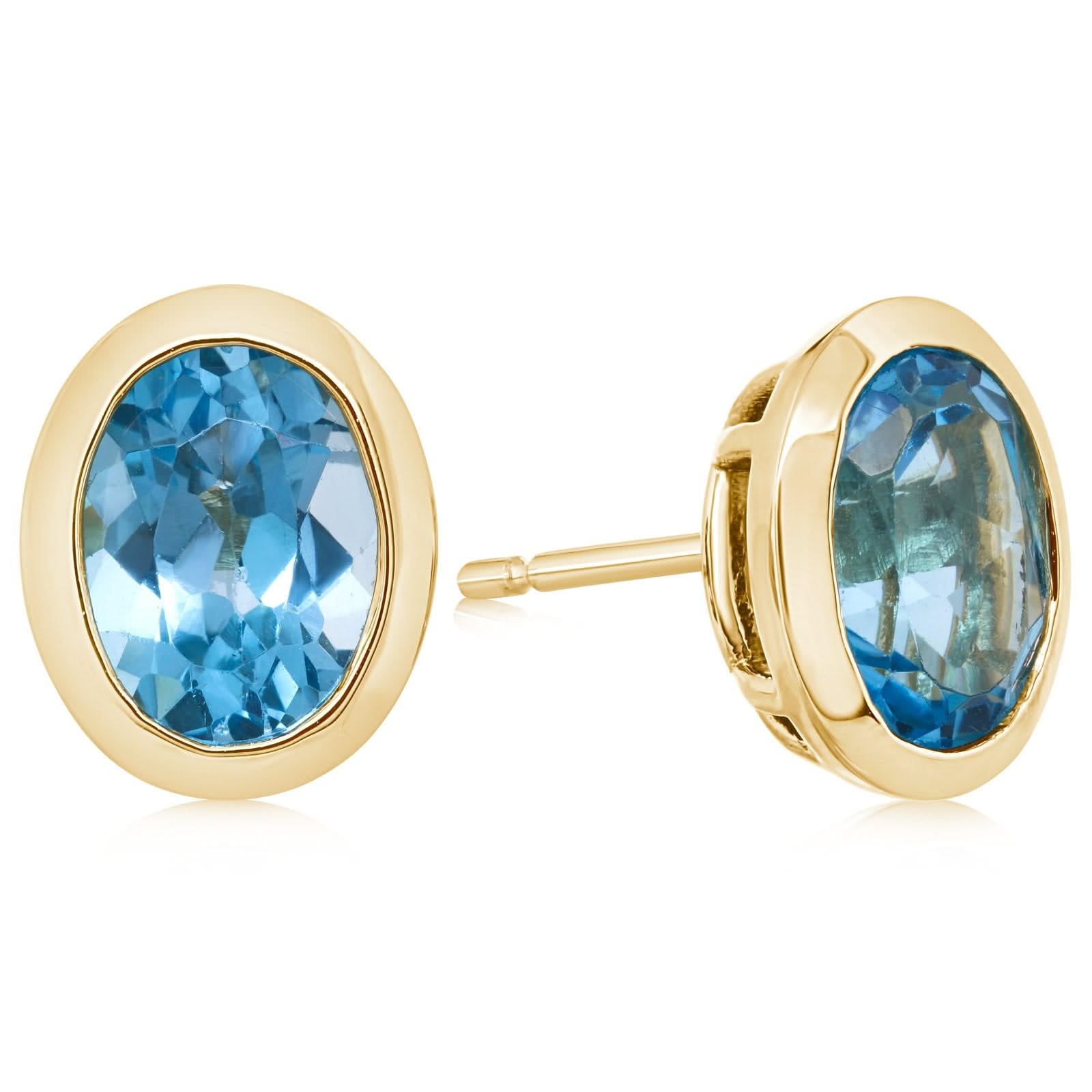 14K yellow gold Swiss blue topaz earrings from the Reis-Nichols Collection. The earrings feature two oval Swiss blue topaz weighing approximately 3 ctw and are approximately 10.1mm in height and approximately 8.3mm in width. The topaz are bezel set.