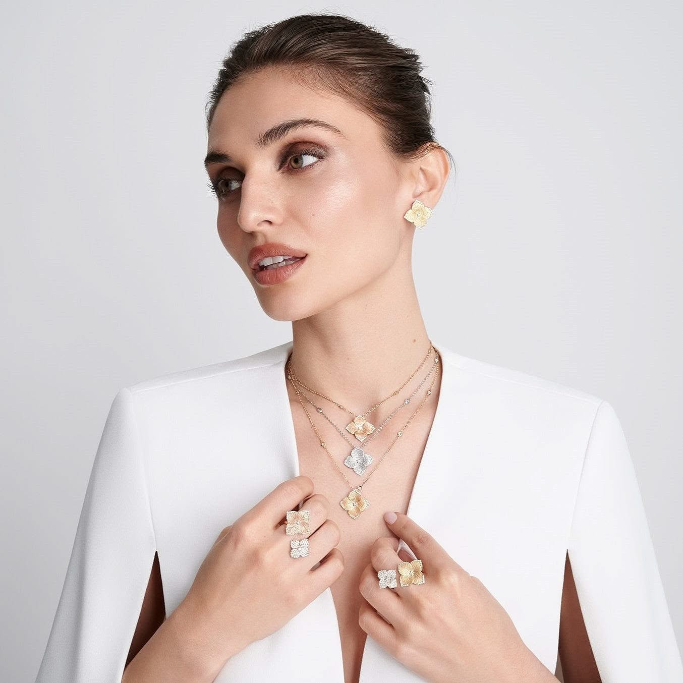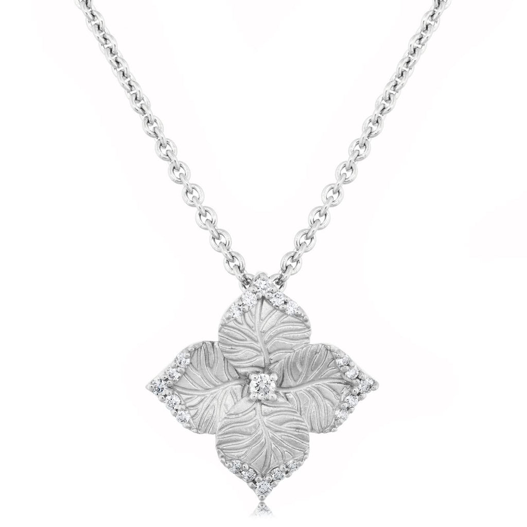 18K white gold 16-18" diamond flower necklace featuring 21 round brilliant cut diamonds weighing approximately .15 ctw. Designed by Piranesi.