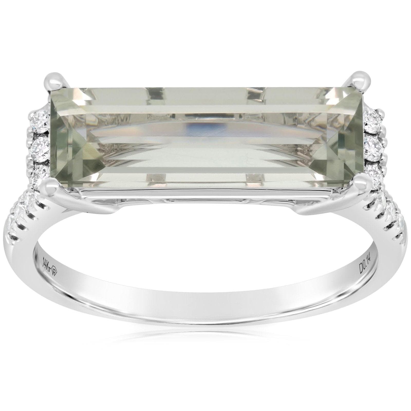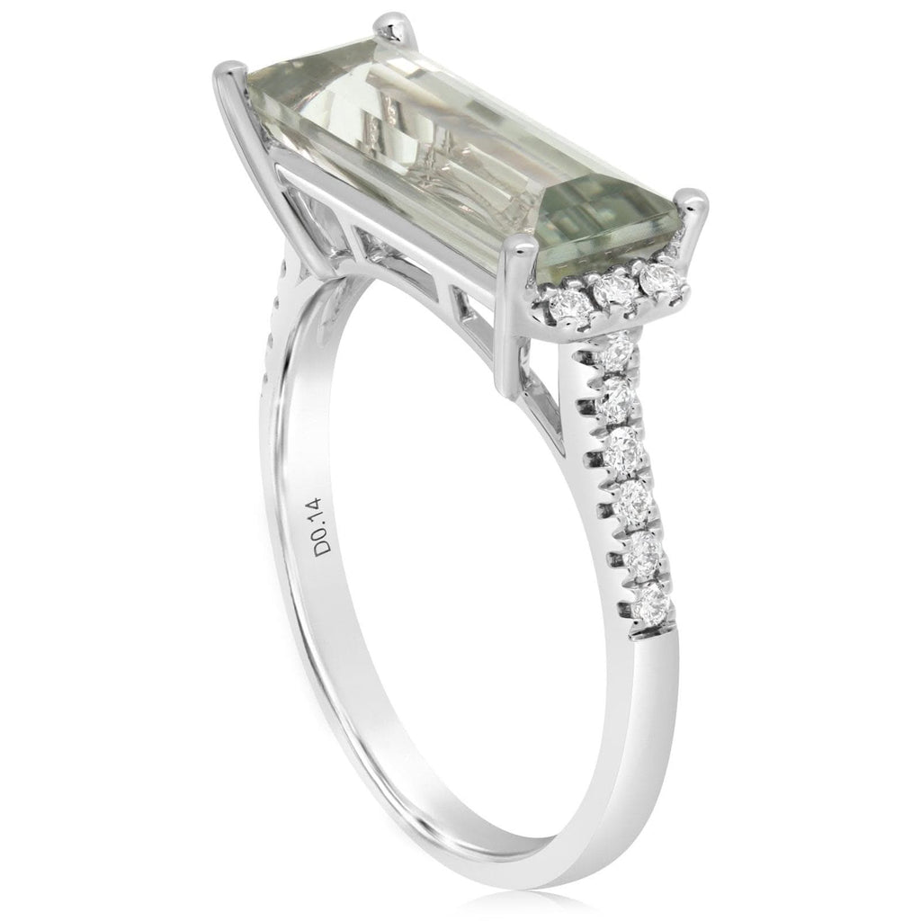 14K white gold green amethyst and diamond ring from the Reis-Nichols Collection. The ring features one baguette cut green amethyst weighing approximately 3.00 ctw, and eighteen brilliant round diamonds weighing approximately 2/10 ctw. Size 6.5 in stock. Special order sizes also available. Pricing may vary with size.