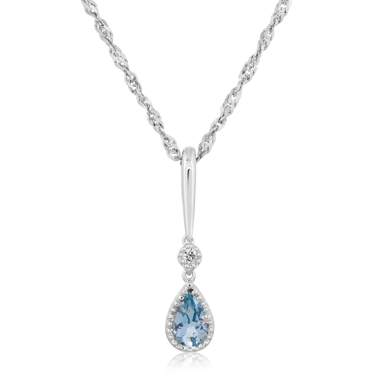 14K white gold aquamarine and diamond pendant from the Reis-Nichols Collection. The pendant features one pear shape aquamarine weighing approximately 1/3 ctw and one brilliant round diamond weighing .02 ctw. The pendant is featured on an 18'' chain.
