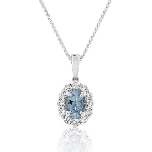 14K white gold aquamarine and diamond pendant from the Reis-Nichols Collection. The pendant features an oval aquamarine weighing approximately 2/3 ct and 12 round brilliant cut diamonds weighing approximately 1/3 ctw. The necklace measures 18" in length.