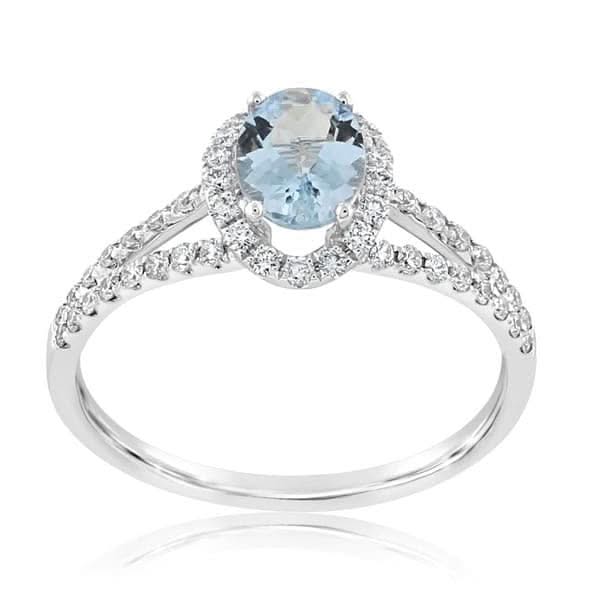 14K white gold aquamarine and diamond ring from the Reis-Nichols Collection. The ring features one oval aquamarine weighing approximately 3/5 ctw (.55-.69) and 54 round brilliant cut diamonds weighing approximately 1/3 ctw (.30-.35). Size 7 in stock now. Special order sizes also available. Pricing may vary with size of ring.