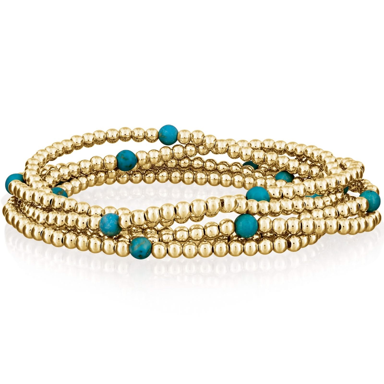 14K yellow gold filled 3mm bead bracelet stack from the Reis-Nichols Collection. The stack features five bracelets with 3 turquoise accent beads.