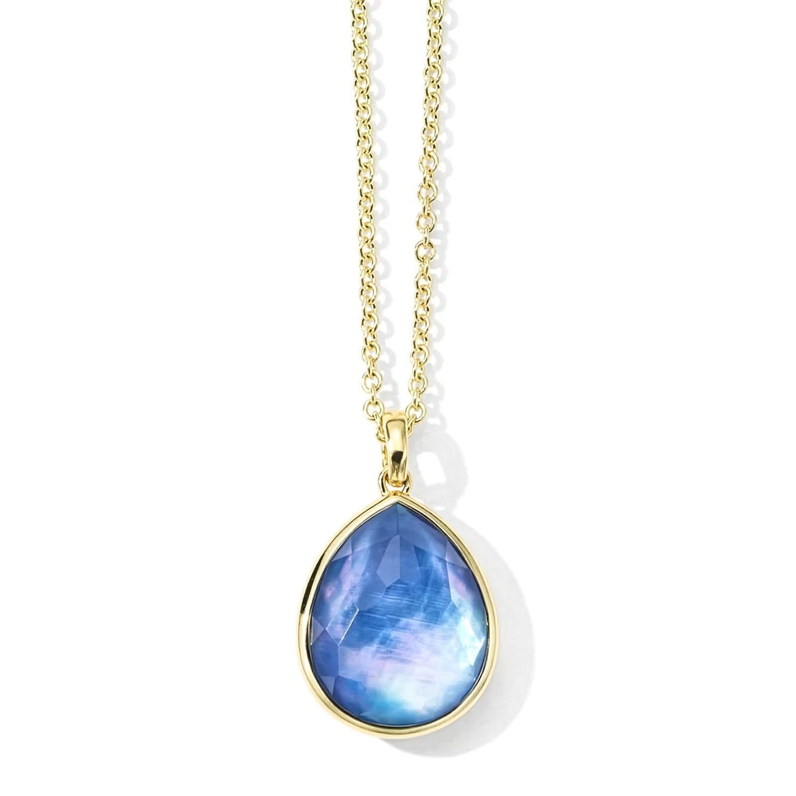 18K yellow gold Rock Candy medium teardrop pendant necklace in London blue topaz. The necklace is adjustable from 16-18" in length. Designed by Ippolita.
