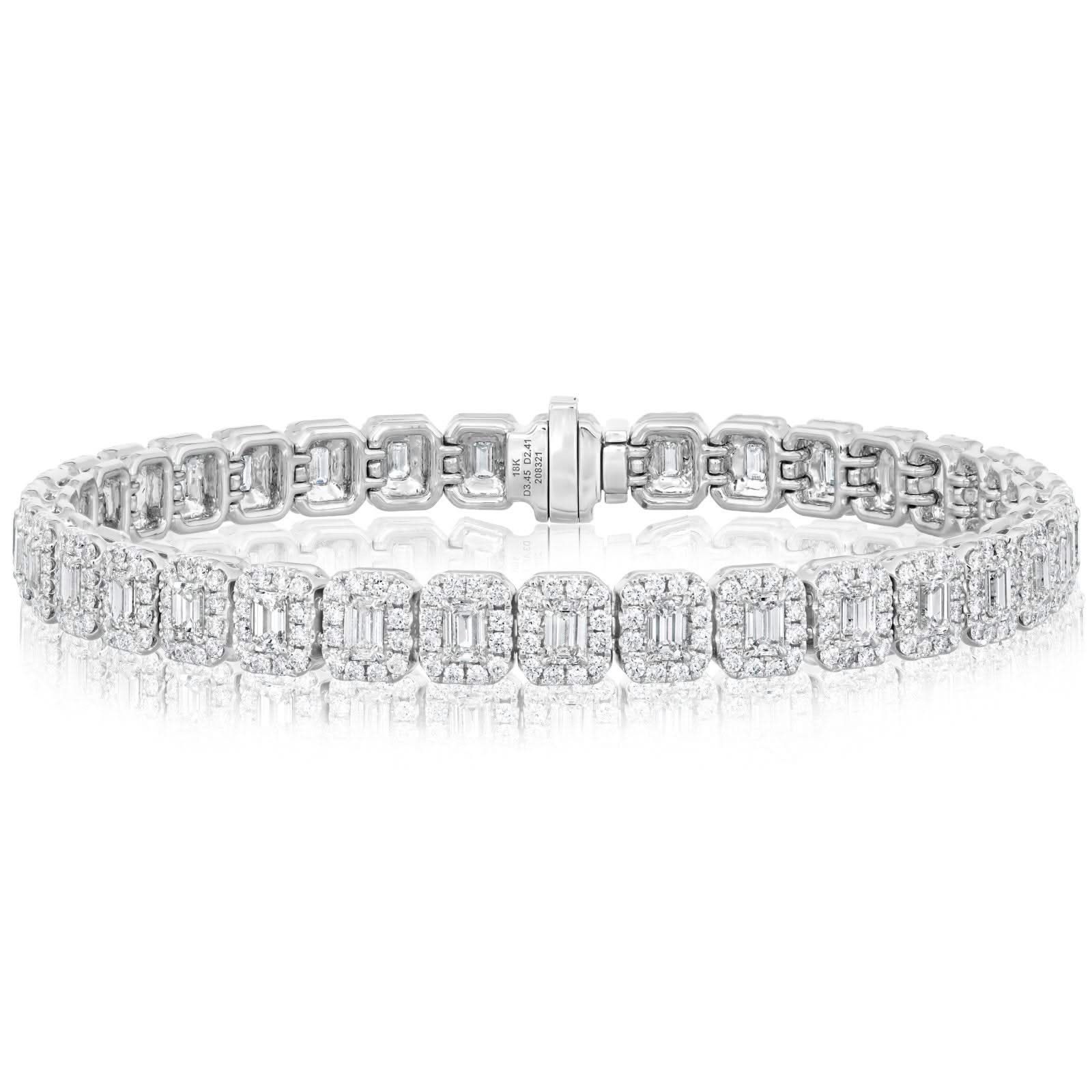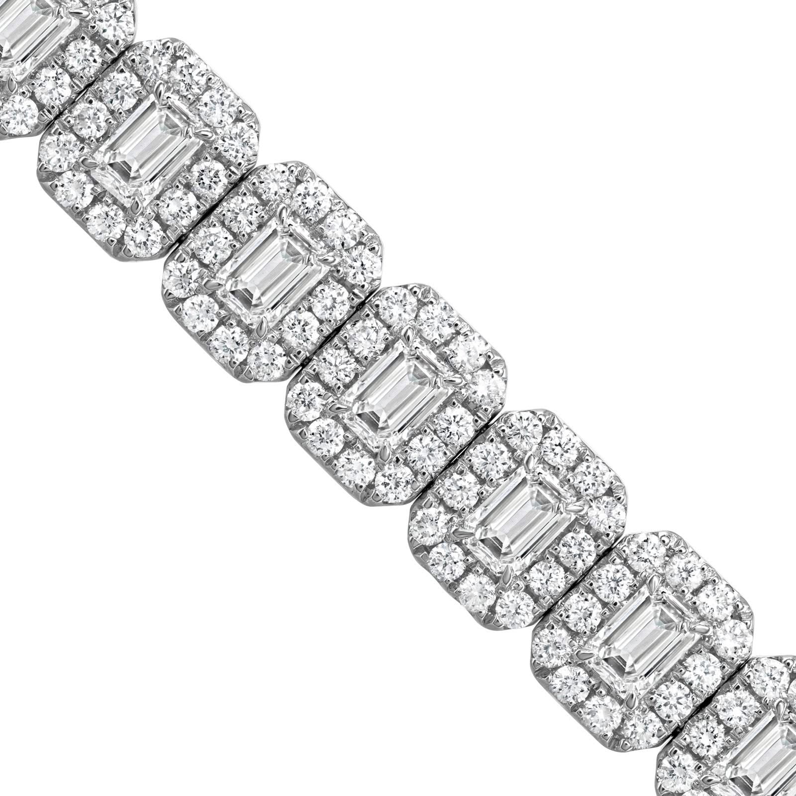 18K white gold diamond halo line bracelet from the Reis-Nichols Collection. The bracelet features 35 emerald cut diamonds weighing 3.45 ctw and 420 round brilliant cut diamonds weighing 2.41 ctw. The bracelet measures 7" in length. Special orders may be available. Please inquire for more details on availability. Pricing may vary depending on size and materials.