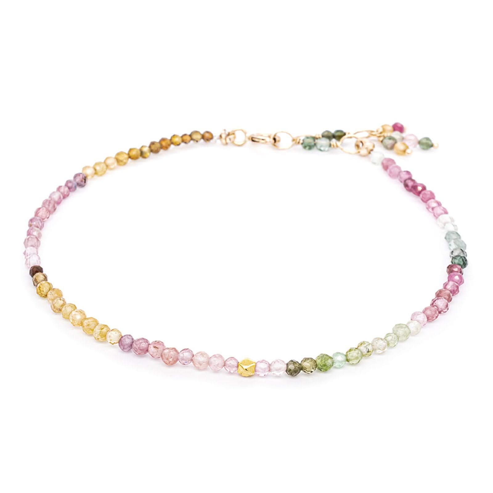 14K yellow gold watermelon tourmaline bead bracelet. The bracelet is adjustable from 6.5-7.5" in length. Designed by Anne Sportun.