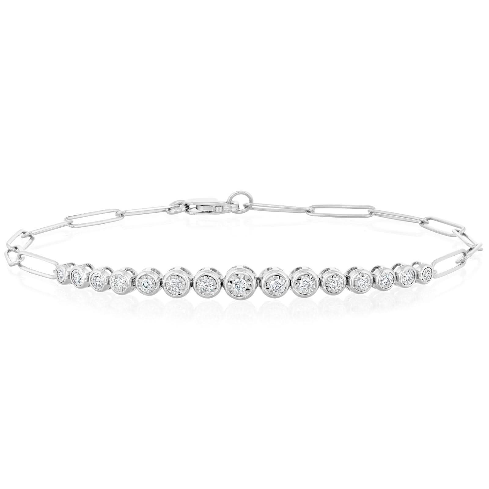 14K white gold diamond paperclip bracelet from the Reis-Nichols Collection. The bracelet features fifteen round brilliant cut diamonds weighing .27 ctw. The bracelet is 7'' in length.