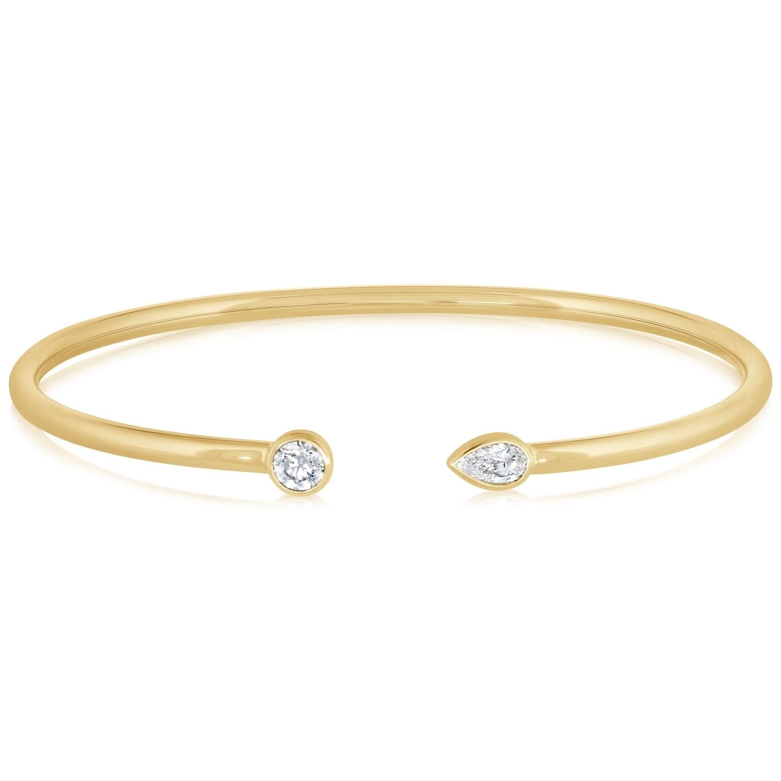 14K yellow gold diamond open cuff bracelet from the Reis-Nichols Collection. The bracelet features one pear shape diamond, and one round brilliant cut diamond weighing approximately 0.48 ctw (0.45-0.50).