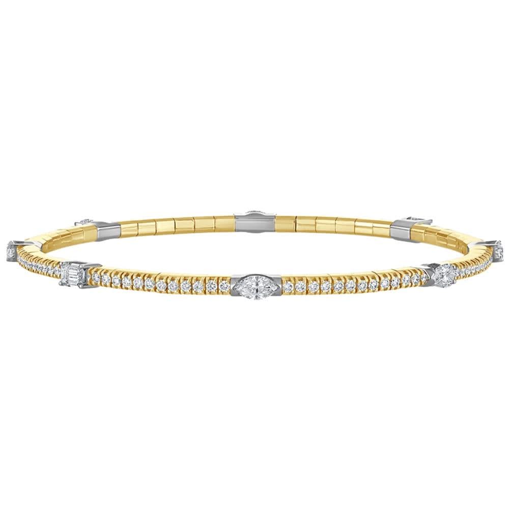 18K yellow and white gold diamond stretch bracelet from the Reis-Nichols Collection. The bracelet features eight multi shape diamonds weighing 1.28 ctw, and 80 round brilliant cut diamonds weighing 1.00 ctw.