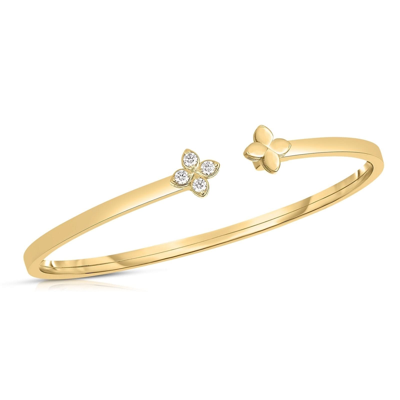 18K yellow gold Love in Verona diamond bangle featuring four round brilliant cut diamonds weighing .08 ctw. Designed by Roberto Coin.