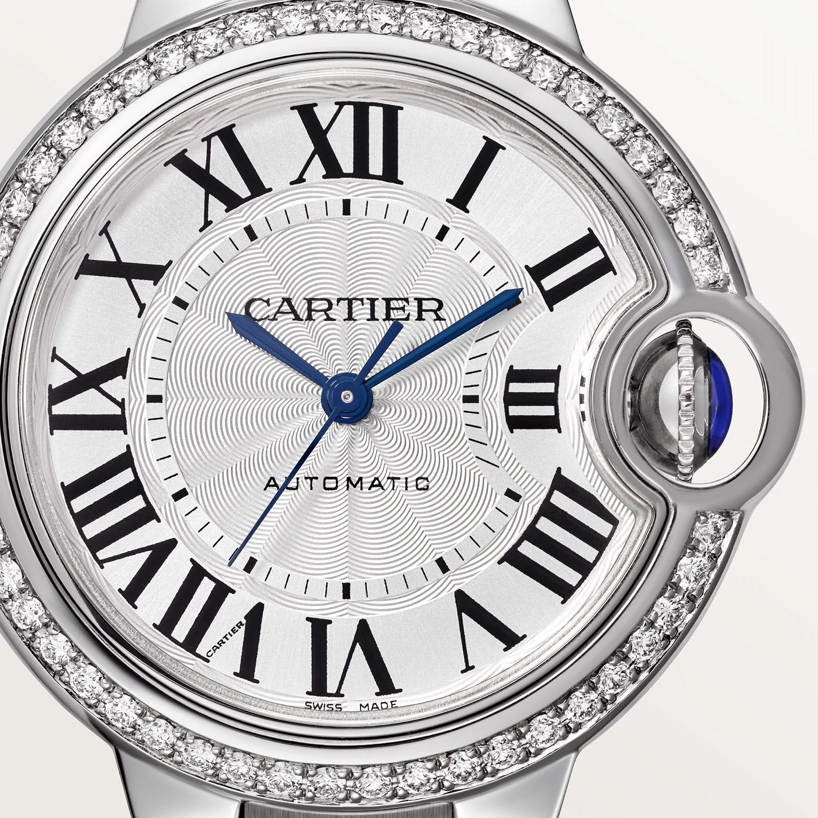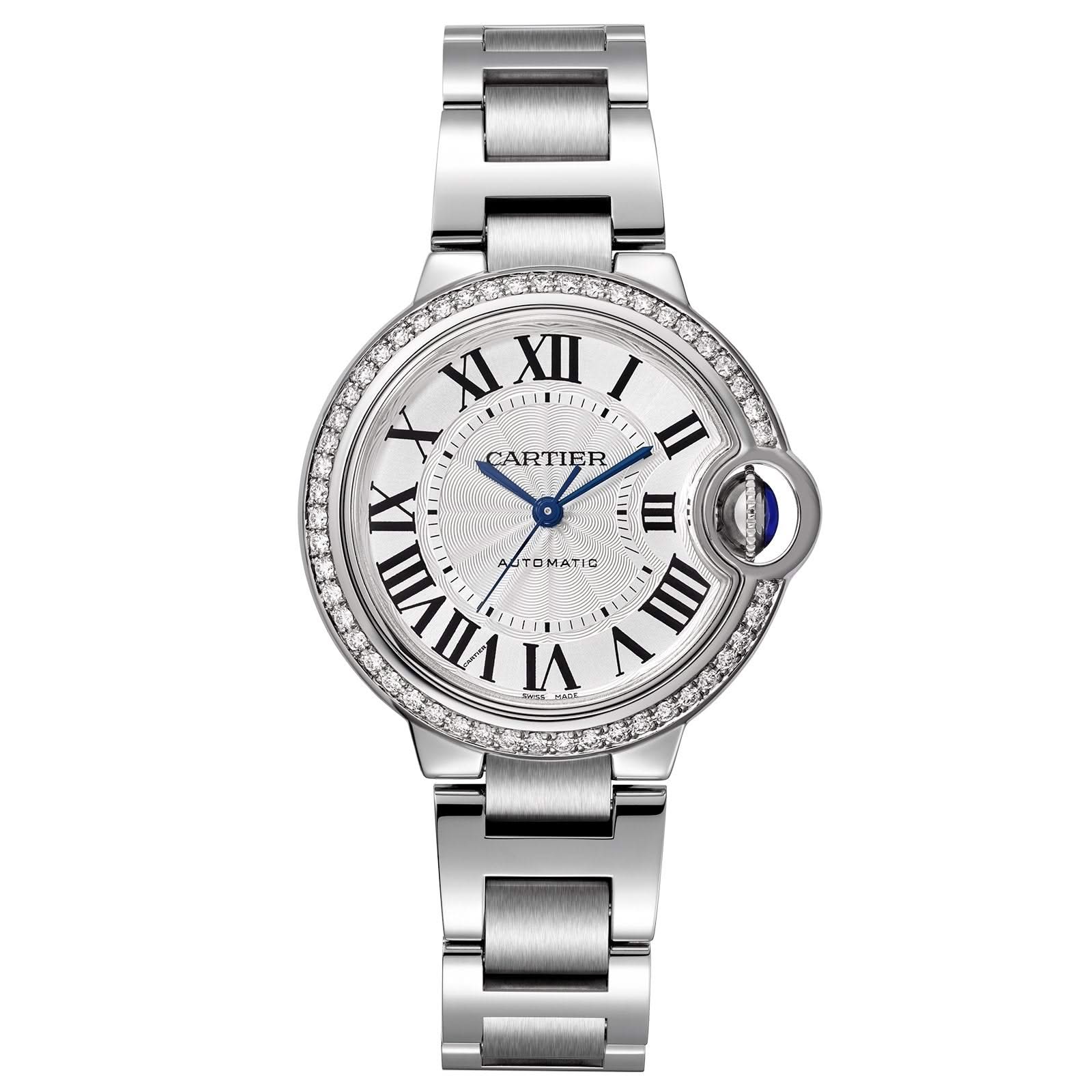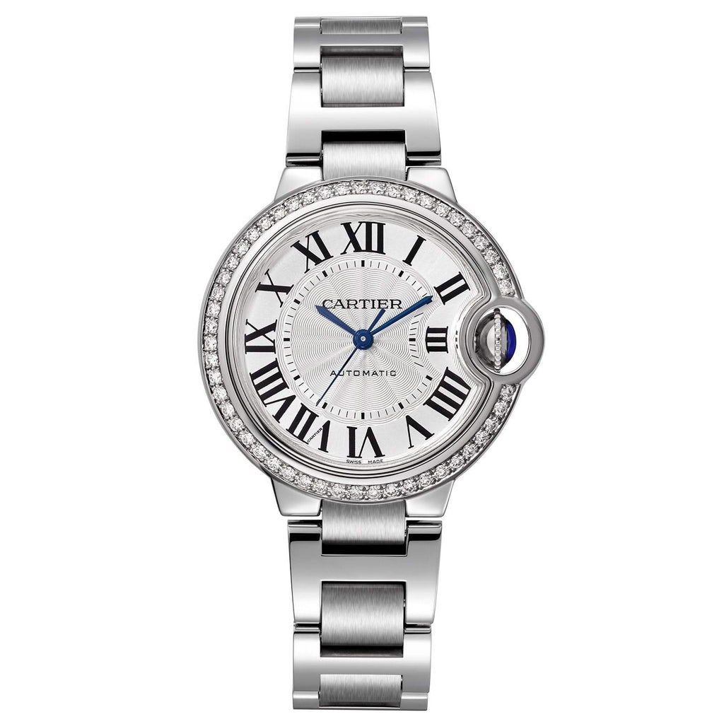 Stainless steel Cartier Ballon Bleu automatic watch featuring a silver Roman dial with a diamond bezel. The watch is 33mm and is attached to a stainless steel bracelet.