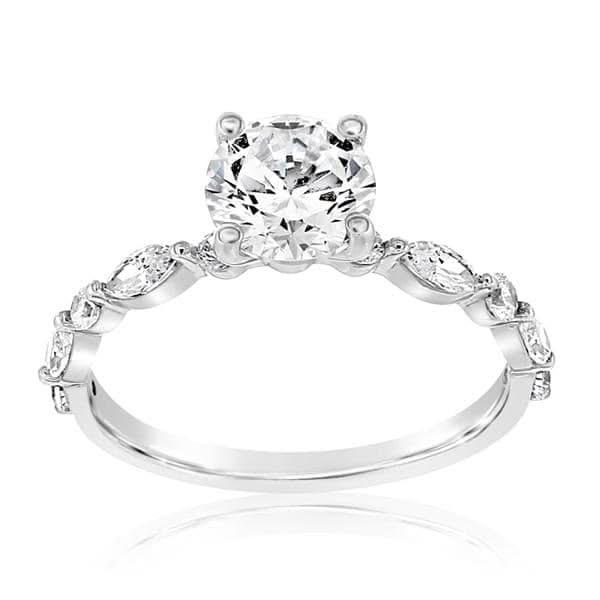 14K white gold diamond engagement ring from the Reis-Nichols Collection. The ring features a six round brilliant cut and four marquise cut diamonds weighing over 1/2 ctw. The ring is designed to hold a 1.00 ct round cut center diamond. Center diamond sold separately. Please call or email for size information and availability.