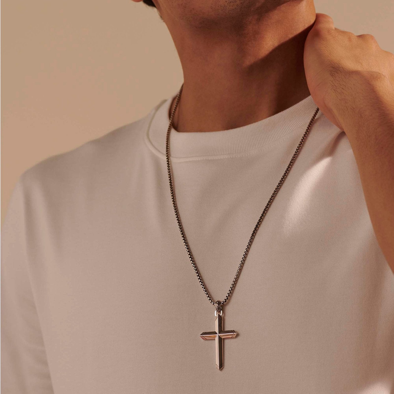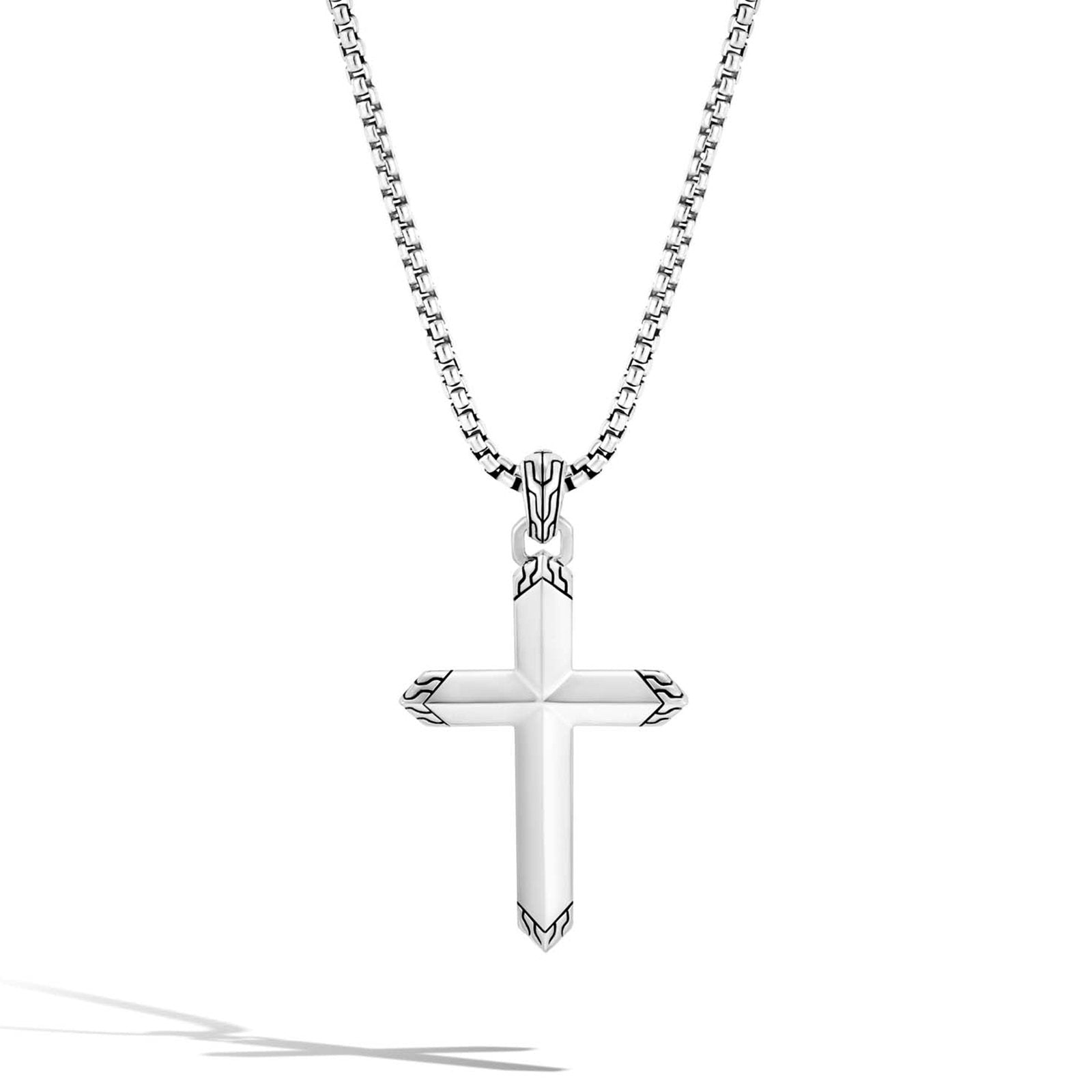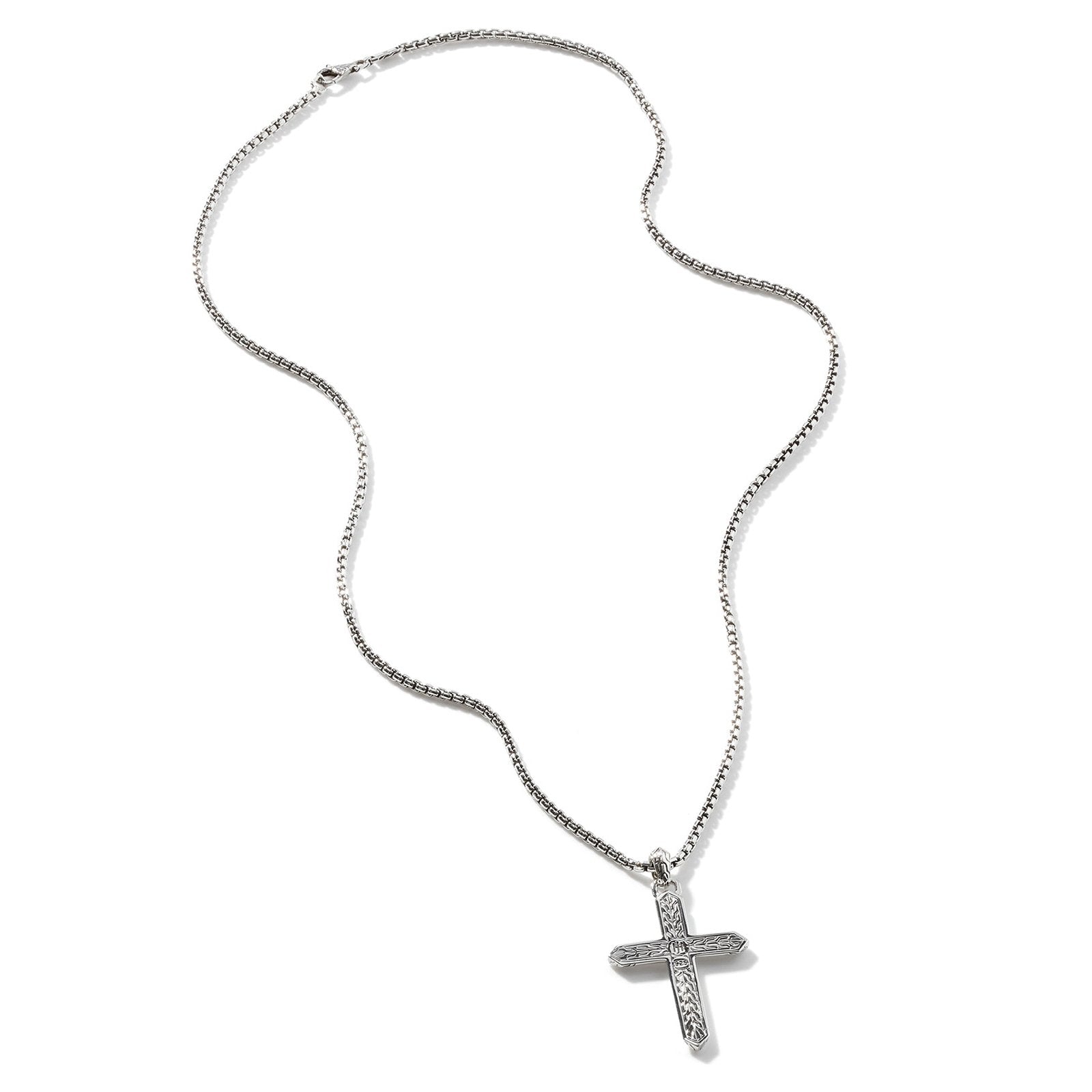 Sterling silver Classic Chain cross pendant on 2.7mm box chain. The necklace measures 26" in length. Designed by John Hardy.