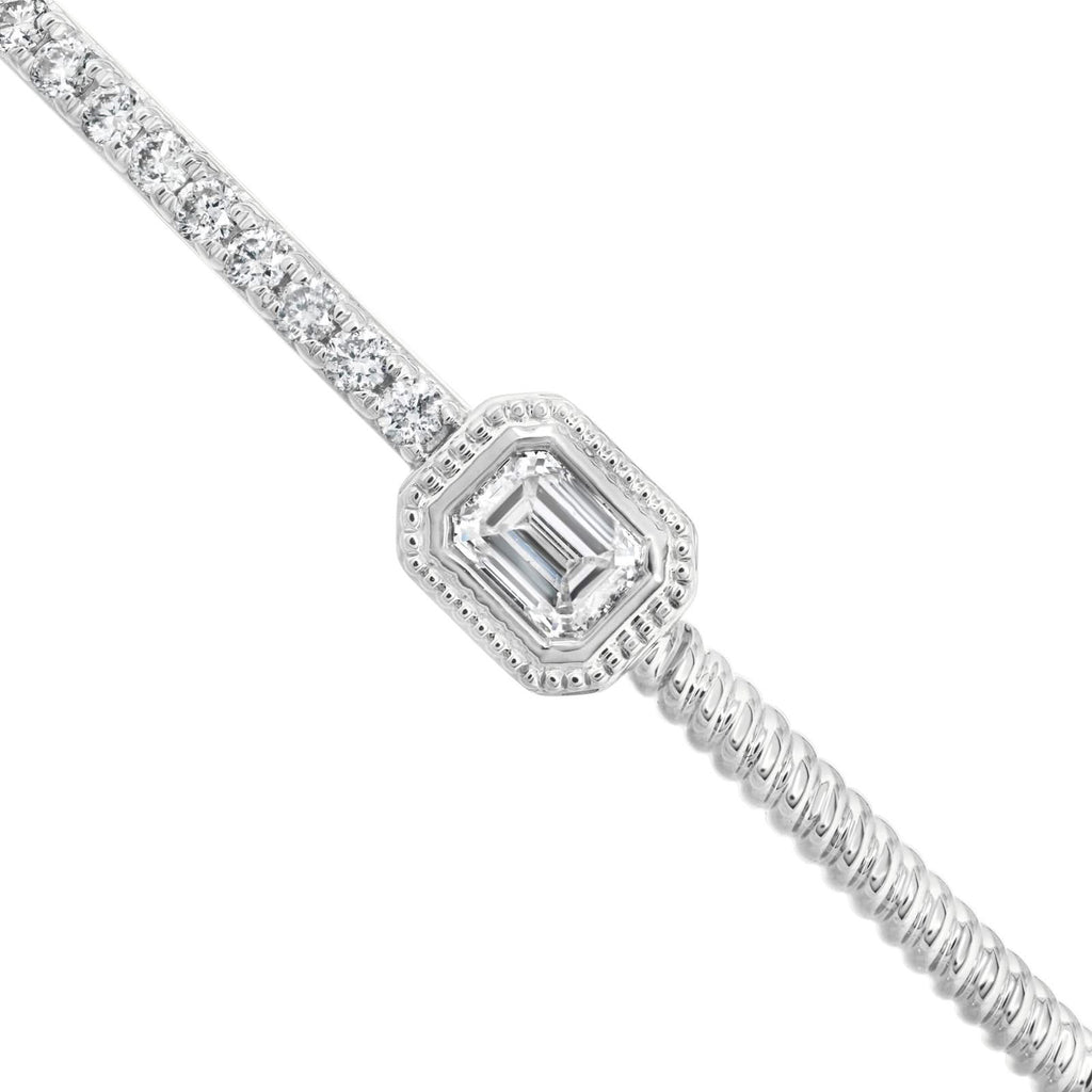 14K white gold diamond bangle from the Reis-Nichols Collection. The bangle features one emerald cut diamond and 20 brilliant round cut diamonds weighing .56 ctw.