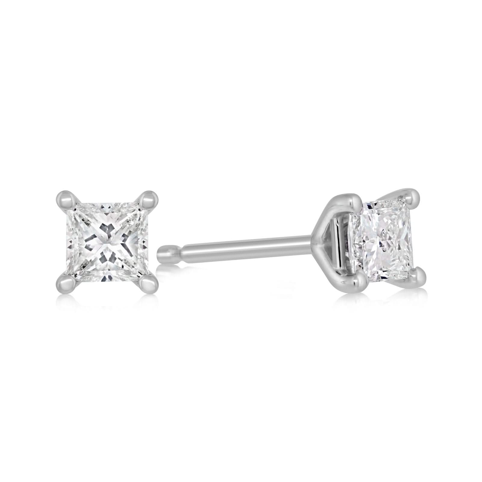 14K white gold princess cut diamond stud earrings designed and created by Reis-Nichols Jewelers. The earrings feature two princess cut diamonds weighing 1/3 ctw (.30-.37). They have a height of approximately 4mm and a width approximately of 4mm. All our diamond stud earrings include diamonds of exceptional cut, color and clarity. Visit either our Indianapolis/Fashion Mall Commons or Greenwood store to view our entire selection of diamond stud earrings.
