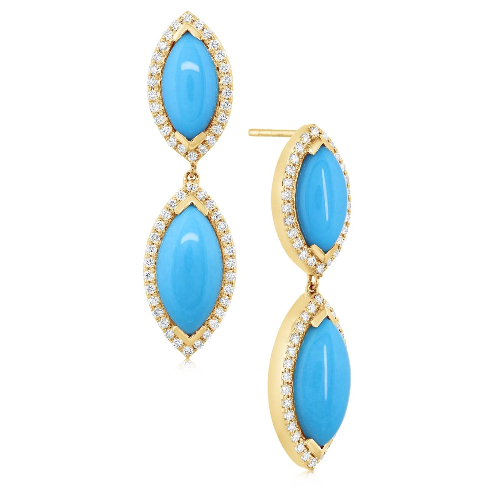 14K Gold 1.28 CTW Cabachon Turquoise & Diamond Drop Earrings