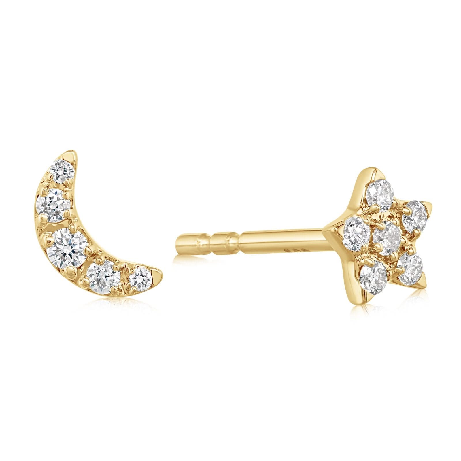 14K yellow gold diamond star & moon pave stud earrings from the Reis-Nichols Collection. The earrings feature 11 round brilliant cut diamonds weighing approximately 1/10 ctw. The moon is approximately 6.4mm in height and approximately 1.9mm in width, and the star is approximately 4.7mm in height and approximately 5.4mm in width.Special orders may be available. Please inquire for more details on availability. Pricing may vary depending on size and materials.