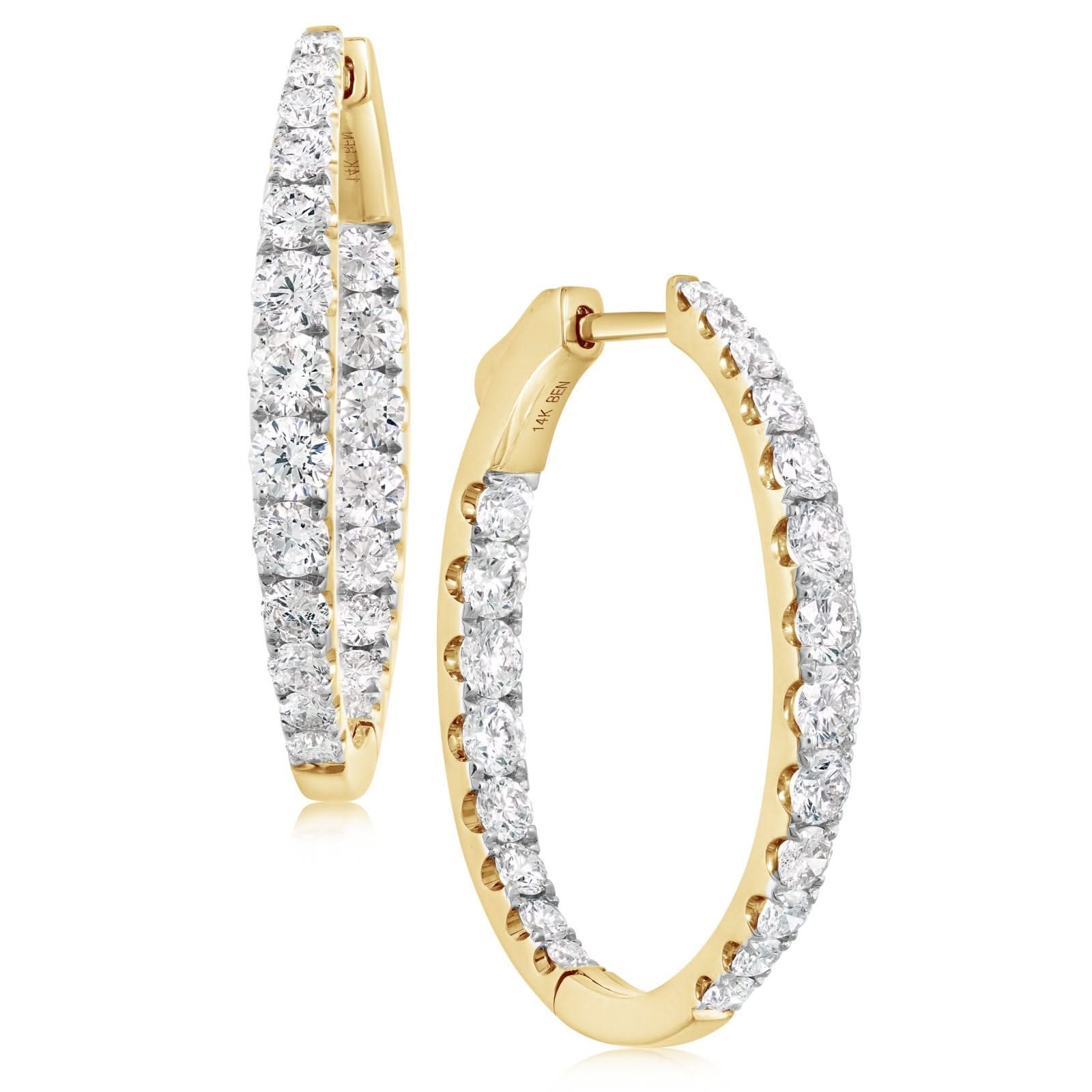 14K yellow gold diamond inside out hoop earrings from the Reis-Nichols Collection. The earrings feature 42 round brilliant cut diamonds weighing 3.71 ctw and approximately 30.6mm in height and approximately 24.1mm in width. The diamonds are graduated and 4-prong set.