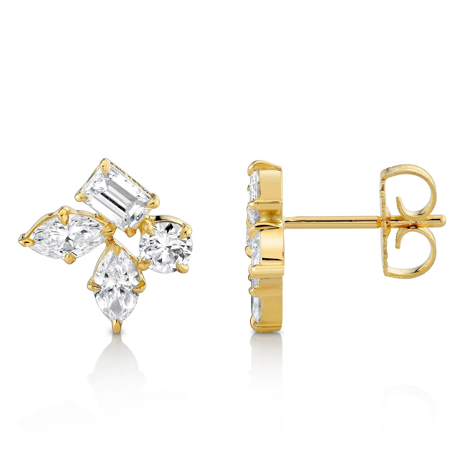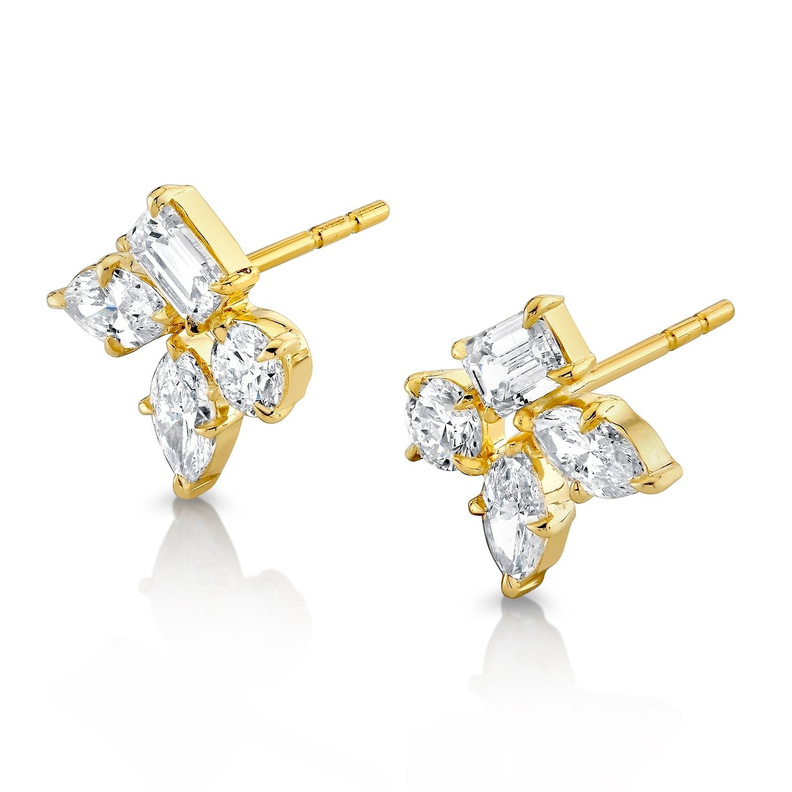 14K yellow gold diamond fancy shape earrings. The earrings feature four marquise, two round brilliant cut diamonds, and two emerald cut diamonds weighing 1.64 ctw. Designed by Michael M.