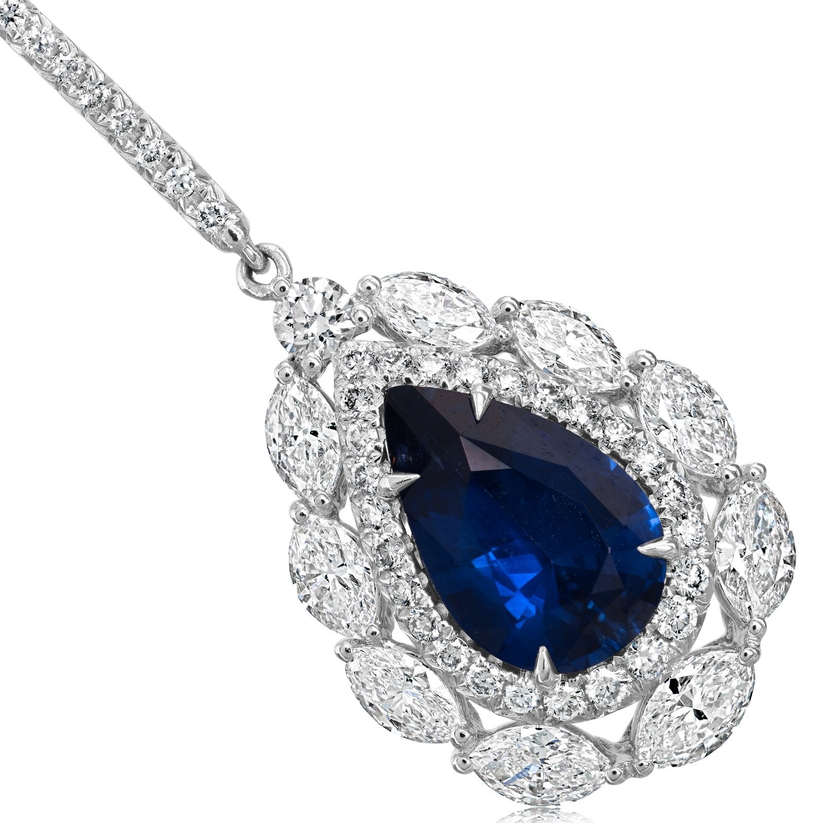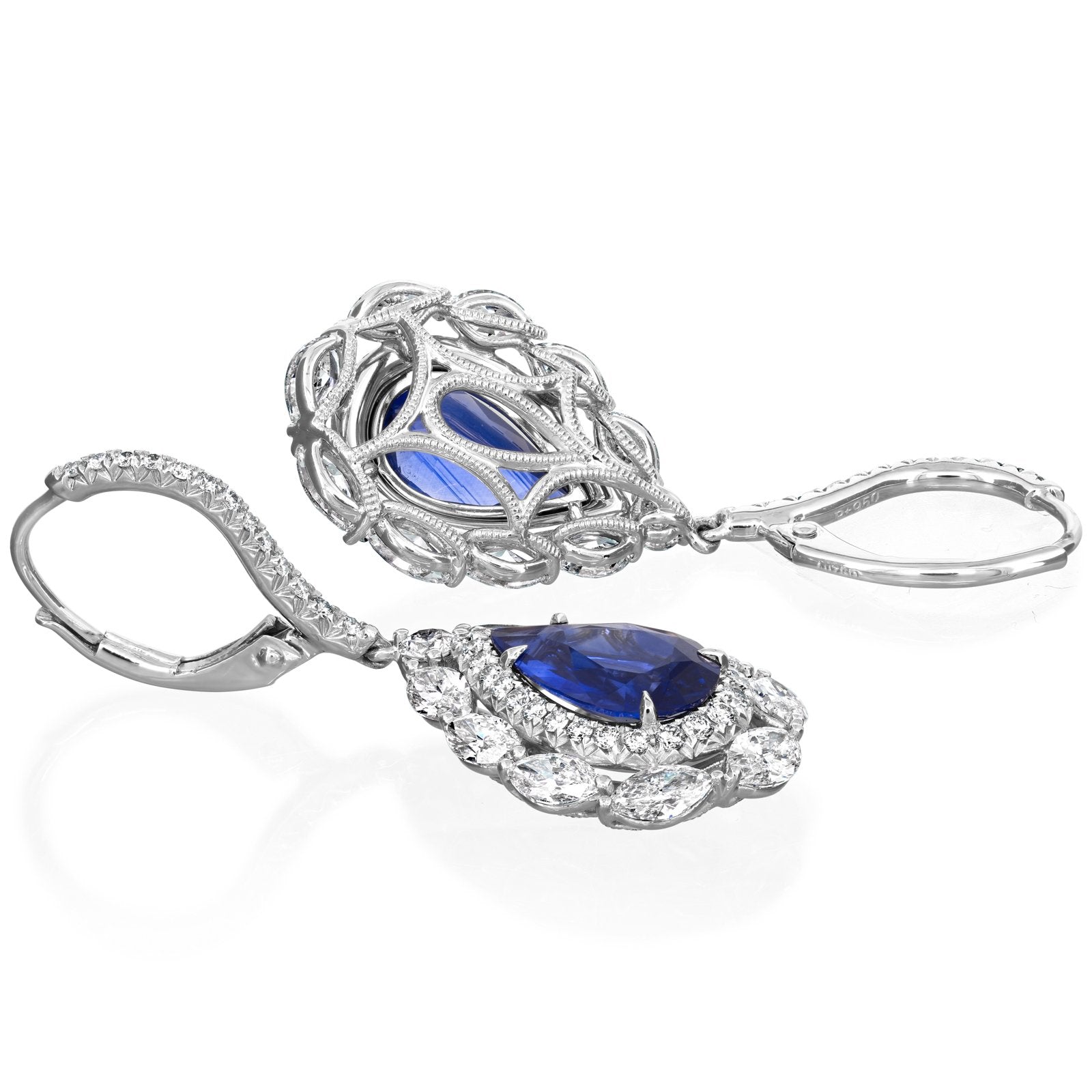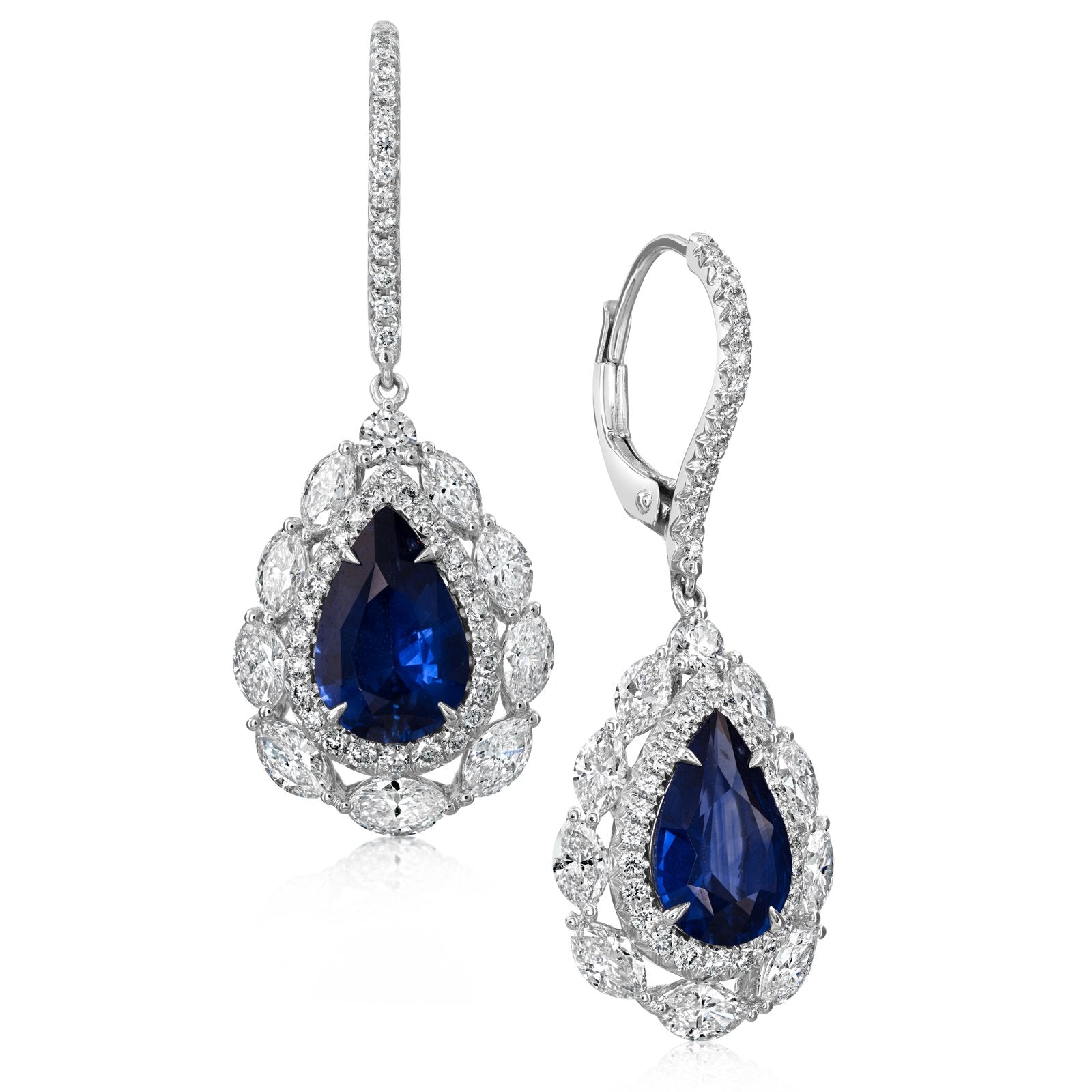 Platinum and 18K white gold sapphire and diamond drop earrings from the Reis-Nichols Collection. The earrings feature two pear shape sapphires weighing 2.97 ctw. The earrings also feature 18 marquise diamonds and 80 round brilliant cut diamonds weighing 2.22 ctw.