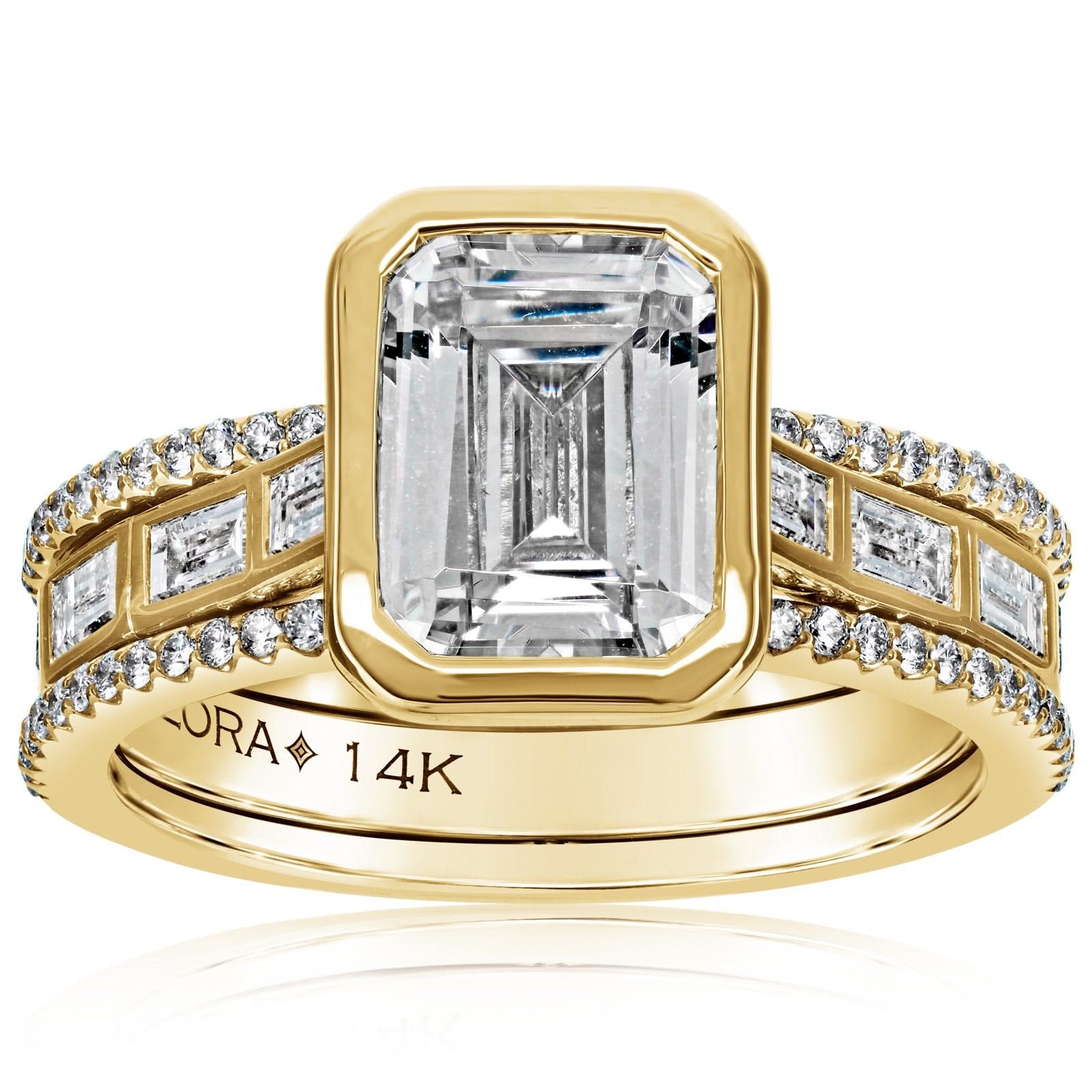 14K yellow gold diamond engagement ring setting from the Reis-Nichols Collection. The ring features eight baguettes, and 68 round brilliant cut diamonds weighing over 3/4ctw. The ring setting is designed to hold a 2ct emerald cut center diamond. Center sold separately. Size 6.5 in stock now. Please call or email for details on special order sizes and availability.