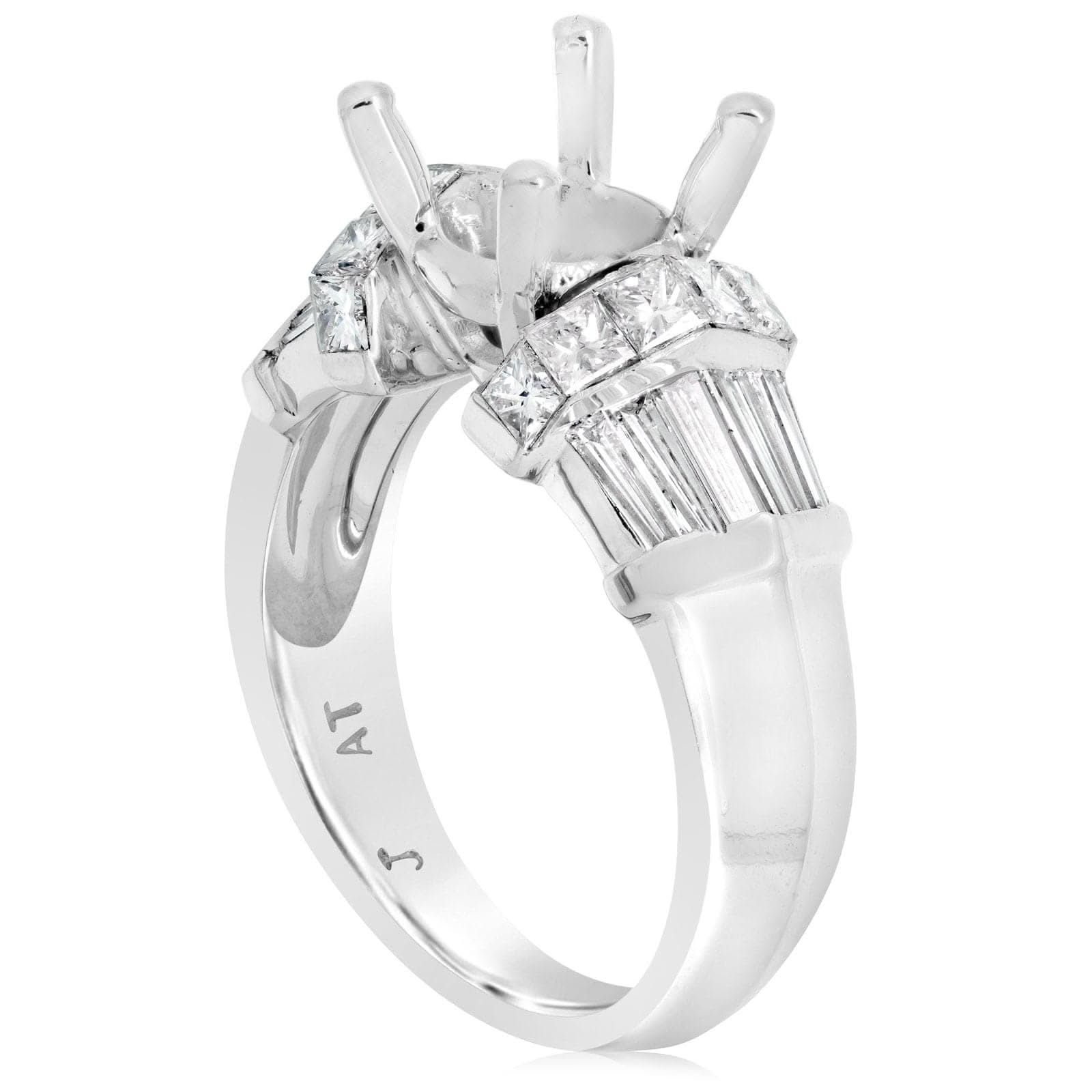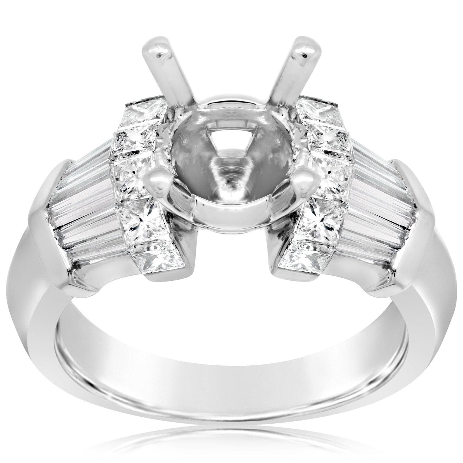 Platinum diamond setting from the Reis-Nichols Collection. The ring features 12 baguette cut diamonds and 12 princess cut diamonds weighing over 1.00 ctw. The setting is made to hold a 7.3mm round center stone. Center stone sold separately. Size 5 in stock. Special order sizes also available. Pricing may vary with size.