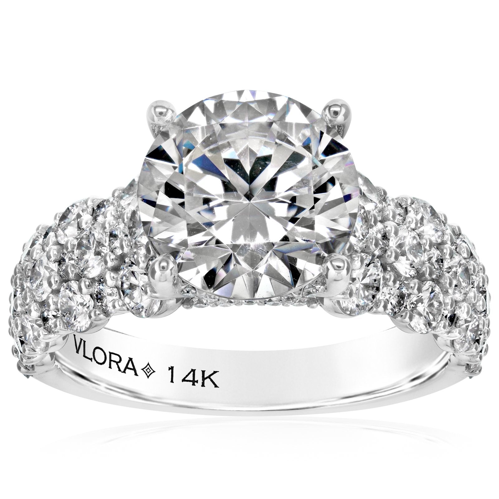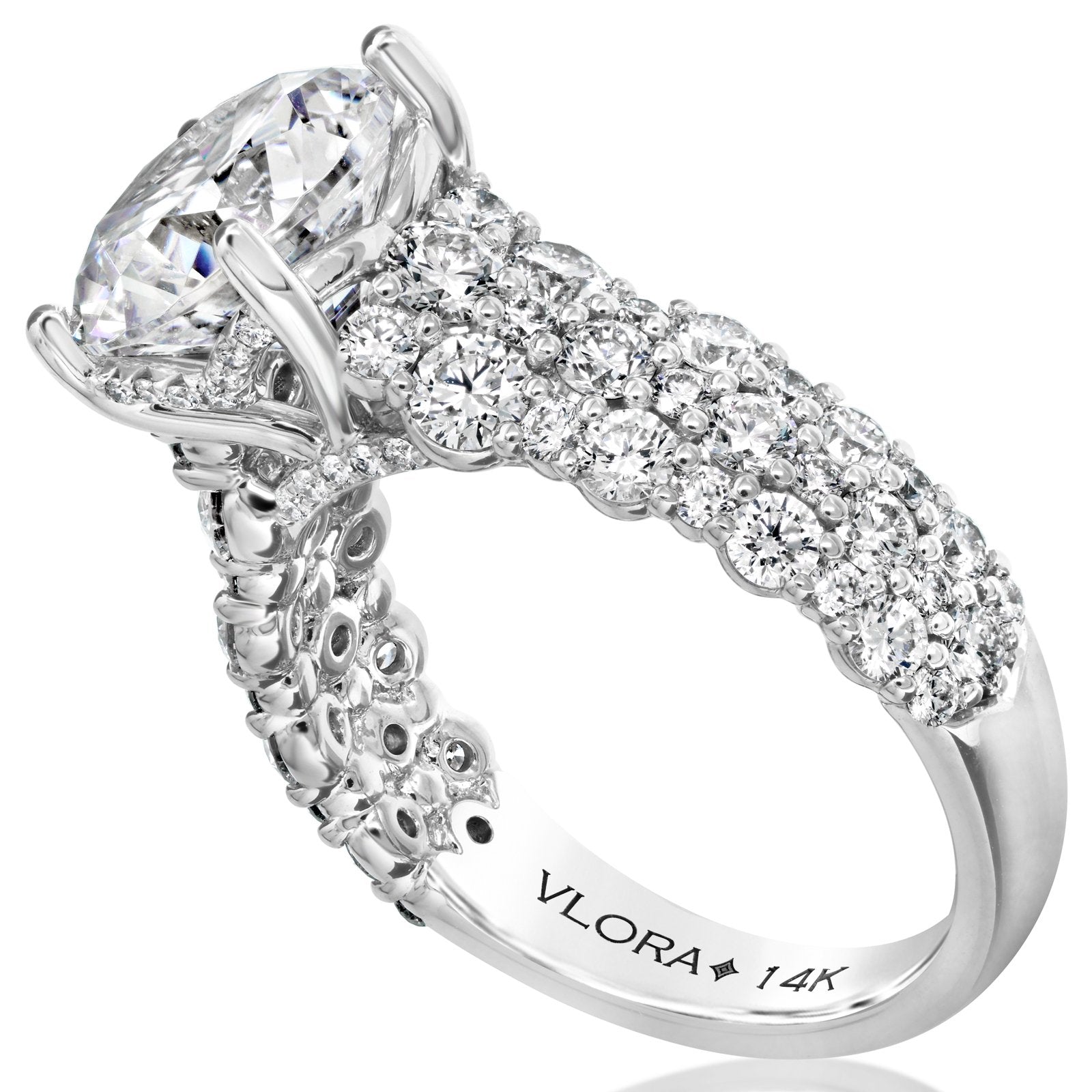 14K white gold diamond engagement ring setting from the Reis-Nichols Collection. The ring features 78 round brilliant cut diamonds weighing over 1 1/2ctw. The ring setting is designed to hold a 3ct round center diamond. Center sold separately. Size 6.5 in stock now. Please call or email for details on special order sizes and availability.