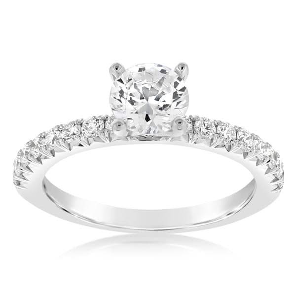 14K white gold diamond engagement ring from the Reis-Nichols Collection. The band features 16 round brilliant cut diamonds weighing just under 1/2 ctw. Size 6.5 in stock now. Special order sizes also available. Pricing may vary with size of ring.
