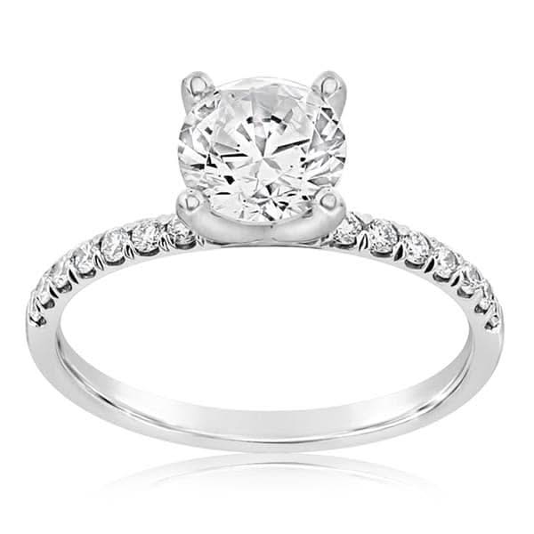 Platinum diamond engagement ring setting from the Reis-Nichols Collection. The ring features 16 round brilliant cut diamonds weighing .24 ctw and is designed to hold a round center diamond. Center diamond sold separately. Size 6.5 in stock now. Special order sizes also available. Pricing may vary with size of ring.