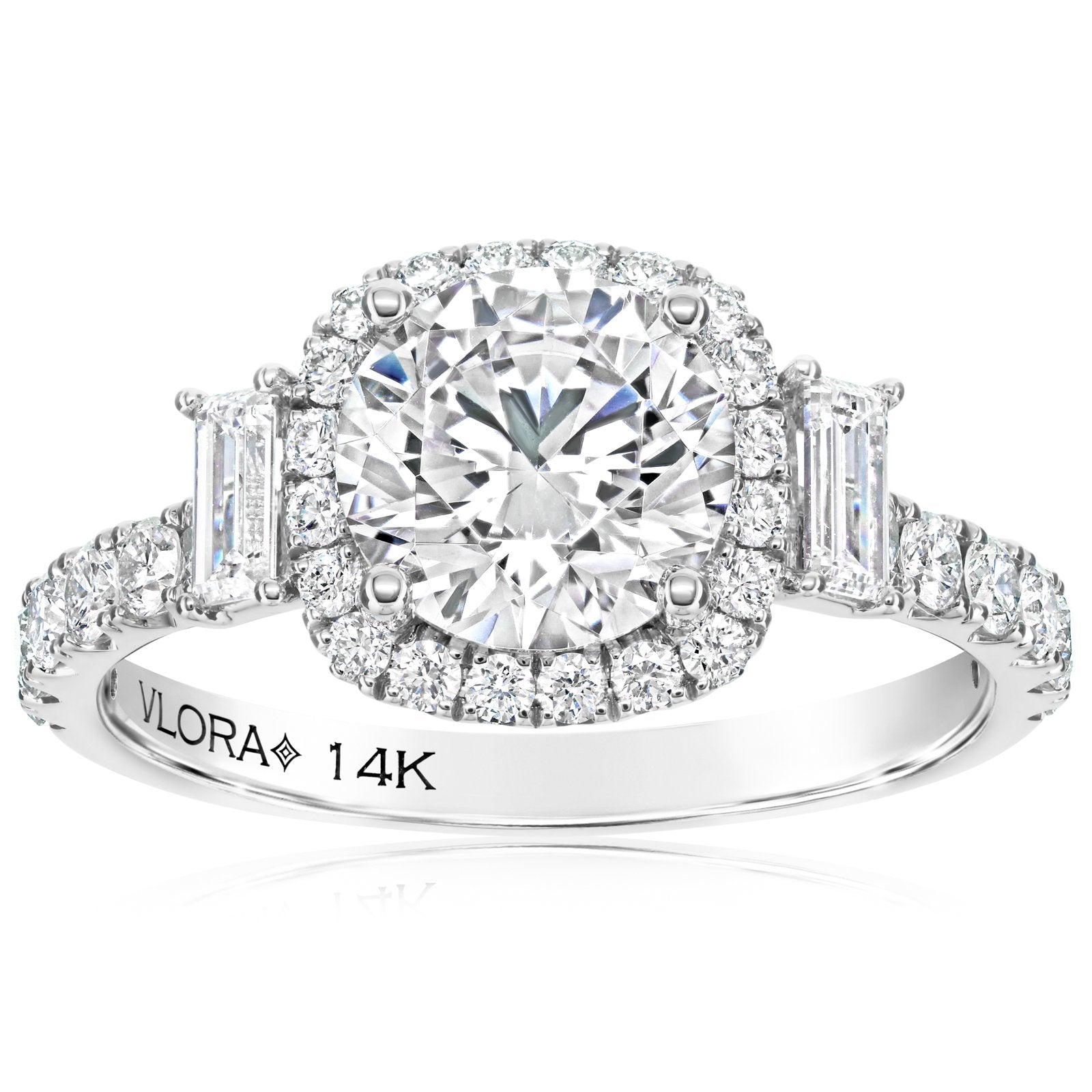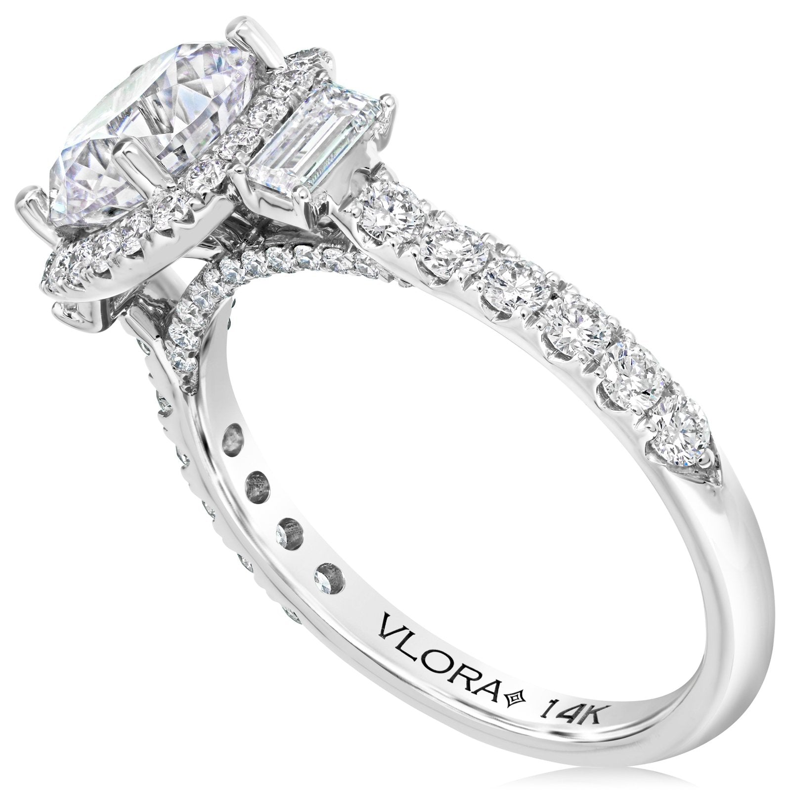 14K white gold diamond three stone engagement ring setting from the Reis-Nichols Collection. The ring features two baguettes, and 54 round brilliant cut diamonds weighing nearly 1 ctw. Size 6.5 in stock now. Please call or email for details on special order sizes and availability.