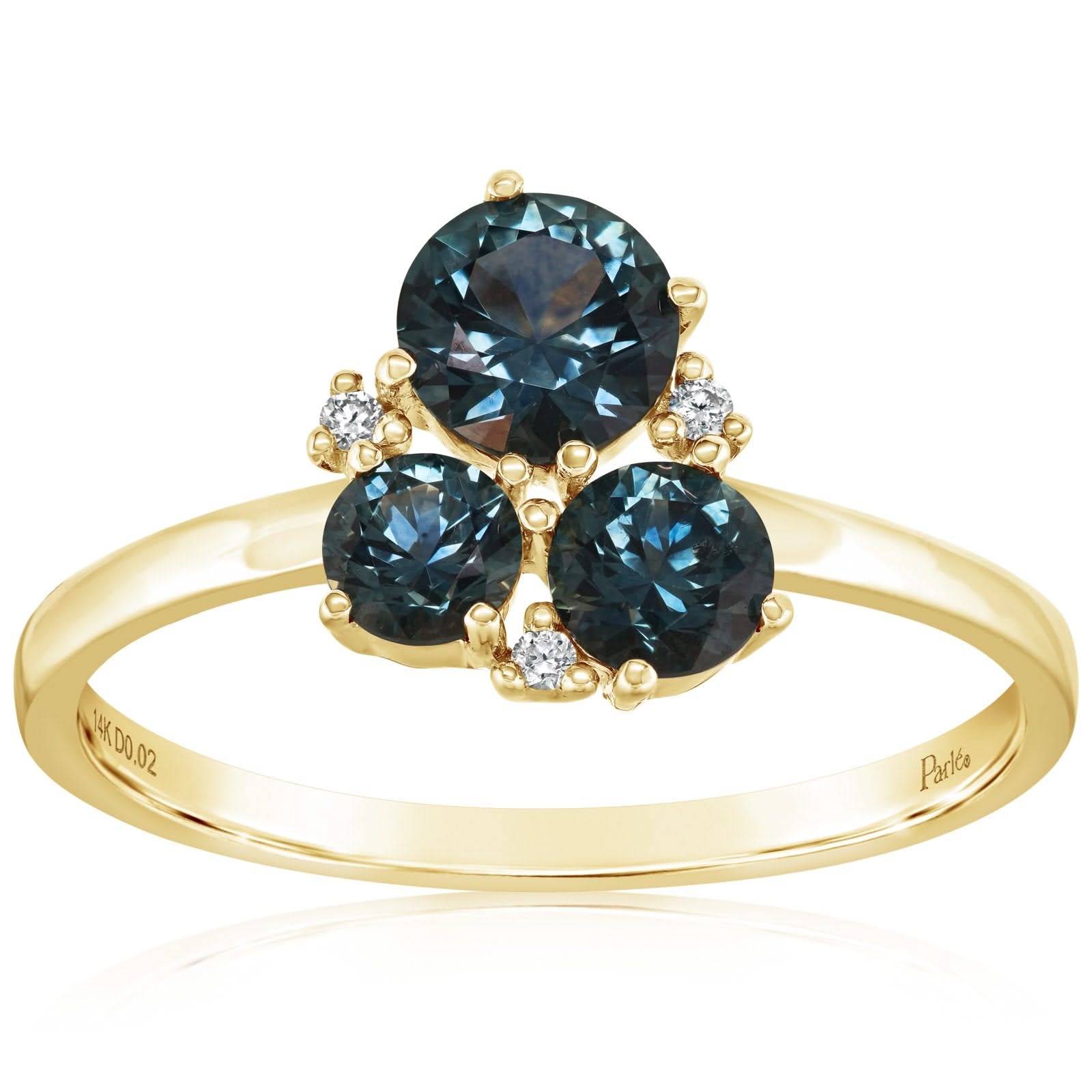 14K yellow gold Montana sapphire & diamond cluster ring from the Reis-Nichols Collection. The ring features three round Montana sapphires weighing 1.11 ctw, and three round brilliant cut diamonds weighing .02 ctw. Size 7 in stock now. Please inquire for more details on availability. Pricing may vary depending on size and materials.