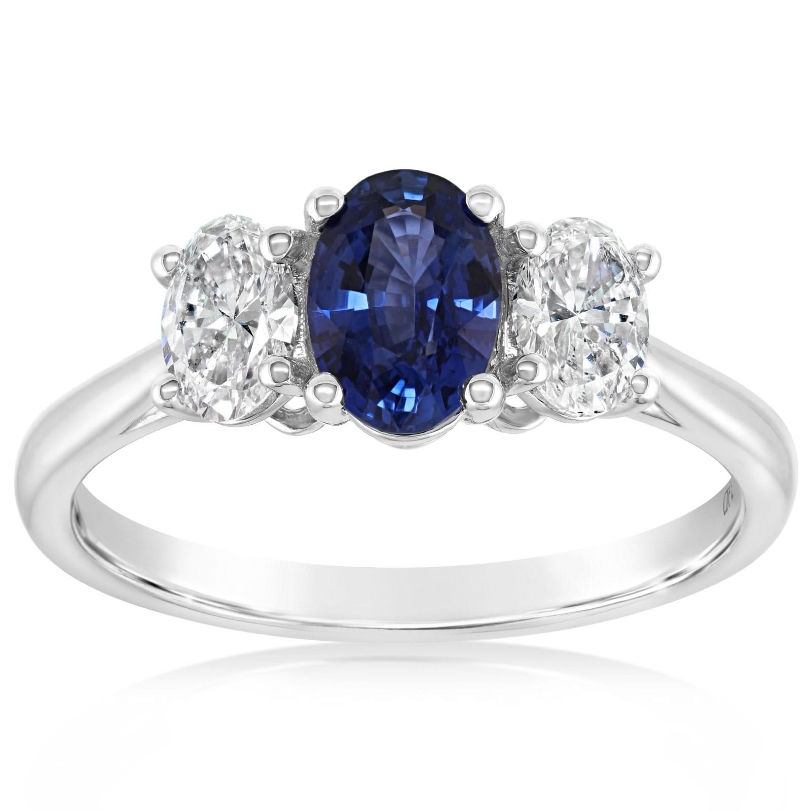 14K white gold sapphire and diamond ring from the Reis-Nichols Collection. The ring features one oval sapphire weighing 1.00 ct and two oval cut diamonds weighing .60 ctw. Size 6.5 in stock now. Please inquire for more details on availability. Pricing may vary depending on size and materials.