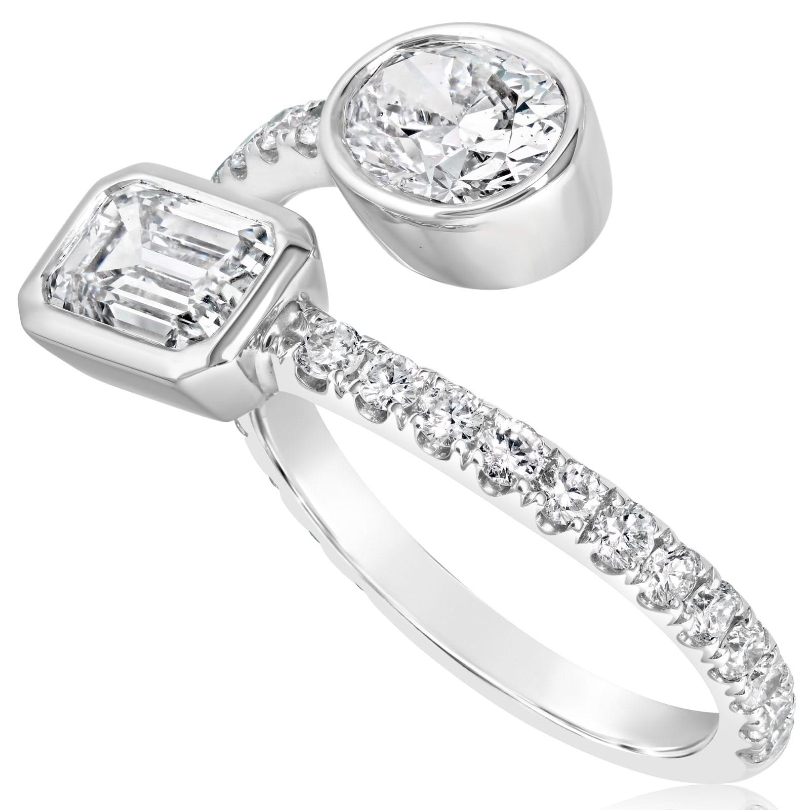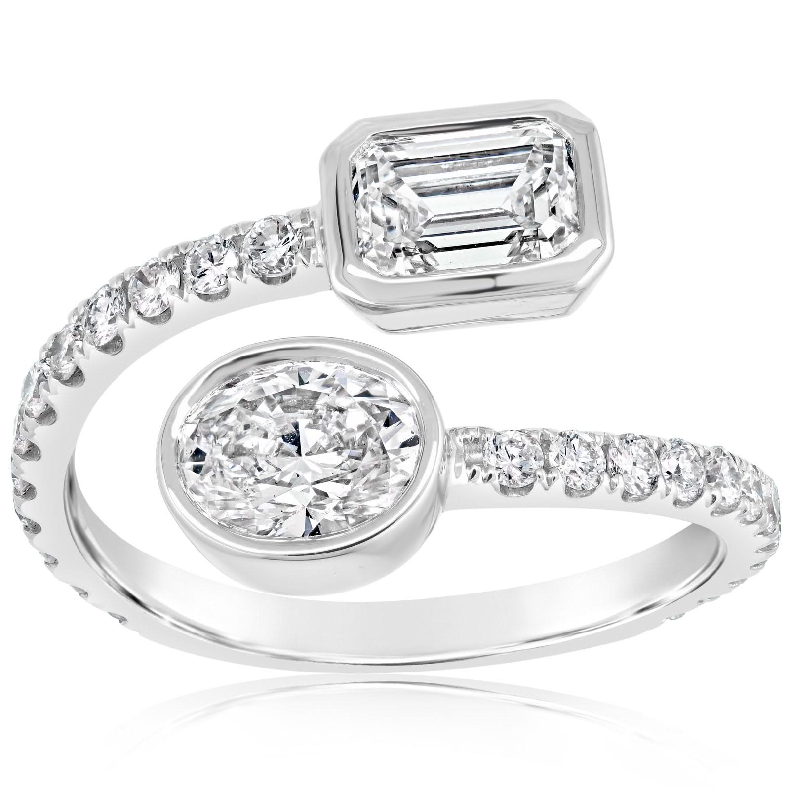 18K white gold diamond bypass fashion ring from the Reis-Nichols Collection. The ring features one oval diamond weighing 0.72 ct, one emerald cut diamond weighing 0.78 ct, and 24 round brilliant cut diamonds weighing 0.45 ctw. Size 6.5 in stock now. Please inquire for more details on availability. Pricing may vary depending on size and materials