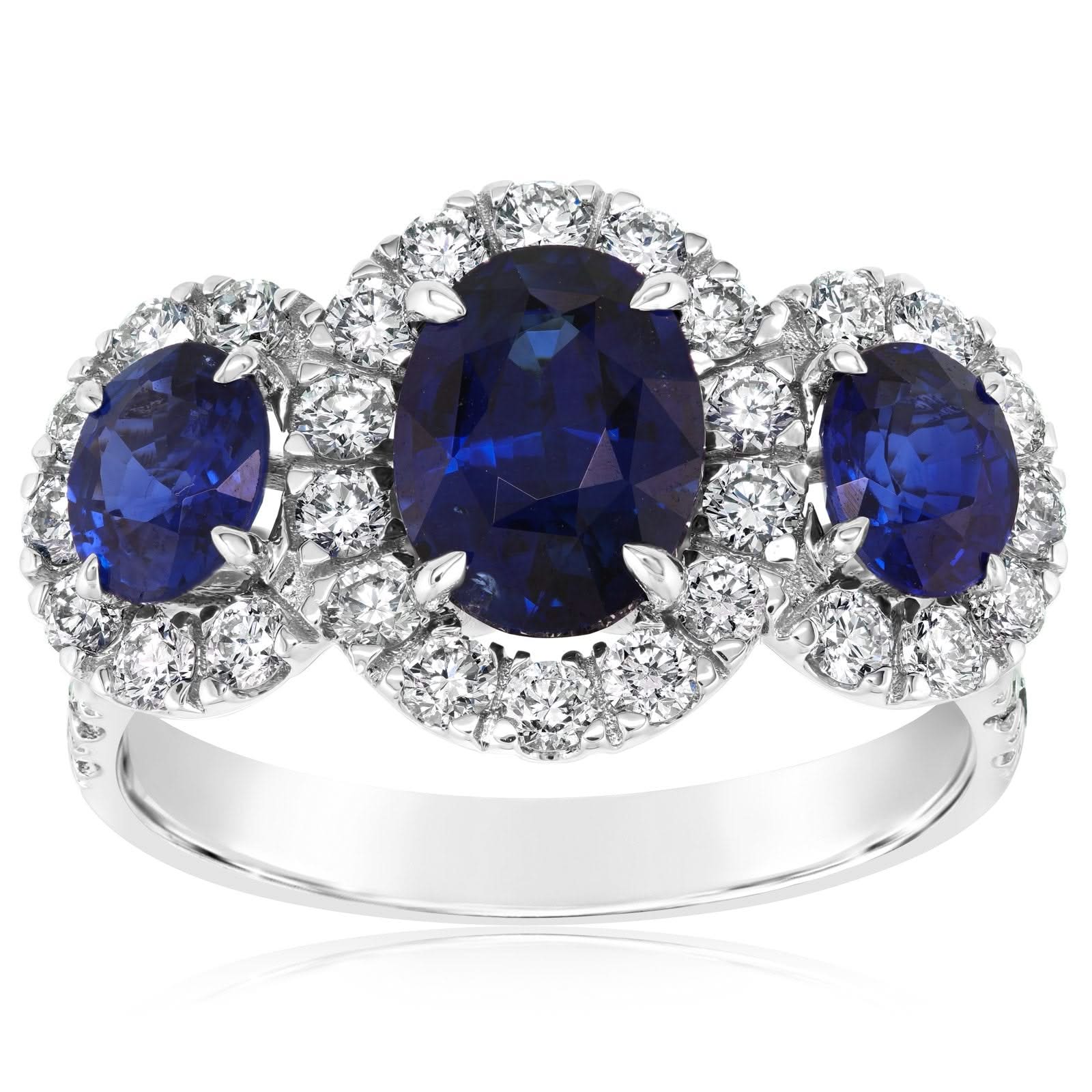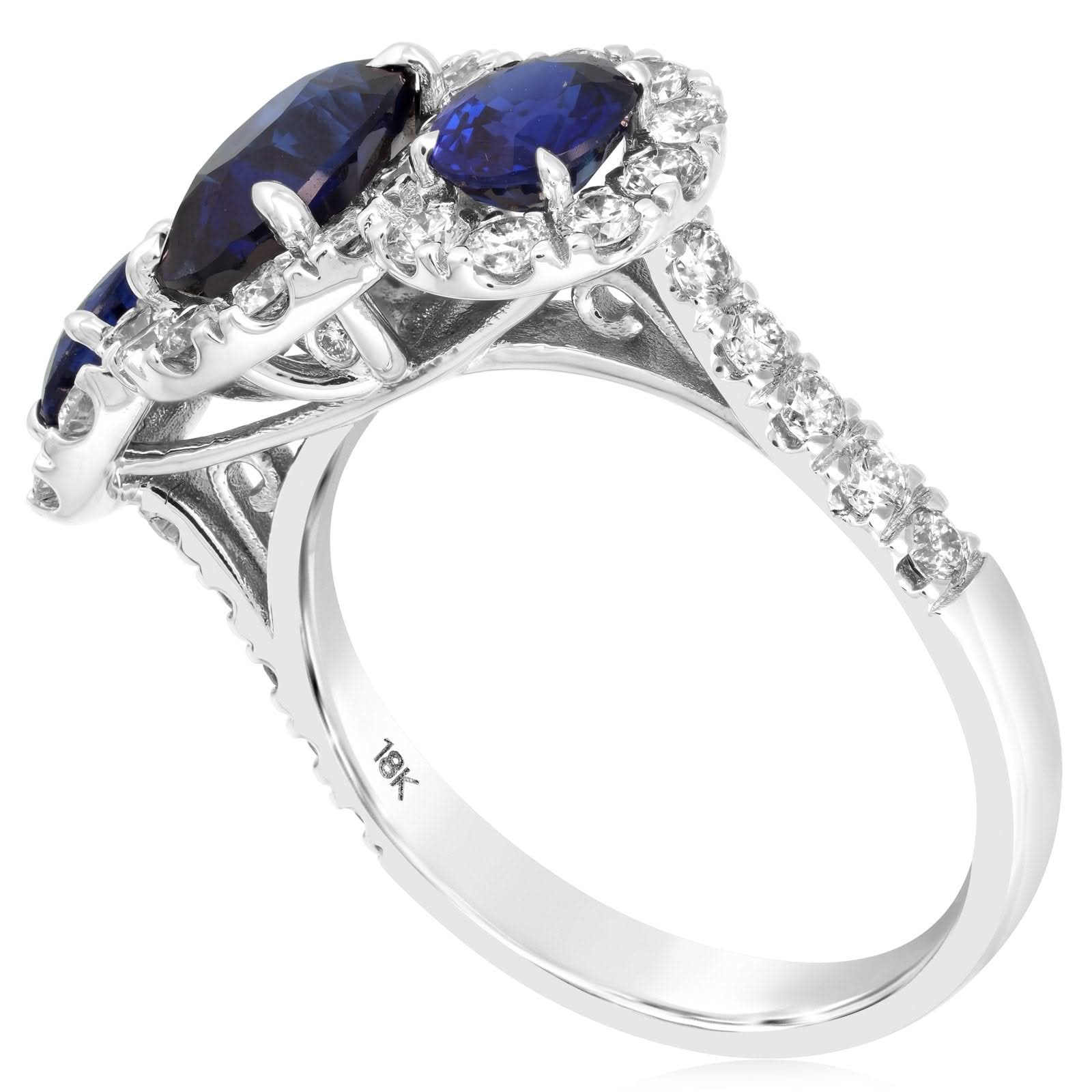 18K white gold sapphire and diamond ring from the Reis-Nichols Collection. The ring features three oval sapphires weighing 2.6 ctw and 40 round brilliant cut diamonds weighing .93 ctw. Size 6 in stock now. Please inquire for more details on availability. Pricing may vary depending on size and materials.