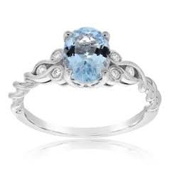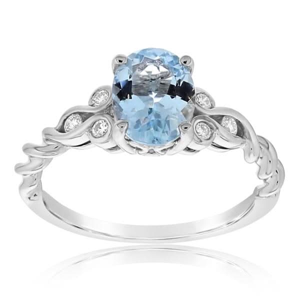 14K white gold aquamarine & diamond ring from the Reis Nichols Collection. The ring features one oval aquamarine weighing over 1ct, and six round brilliant cut diamonds weighing approximately 1/10ctw. Size 6.5 in stock now. Special order sizes available. Pricing may vary with size.