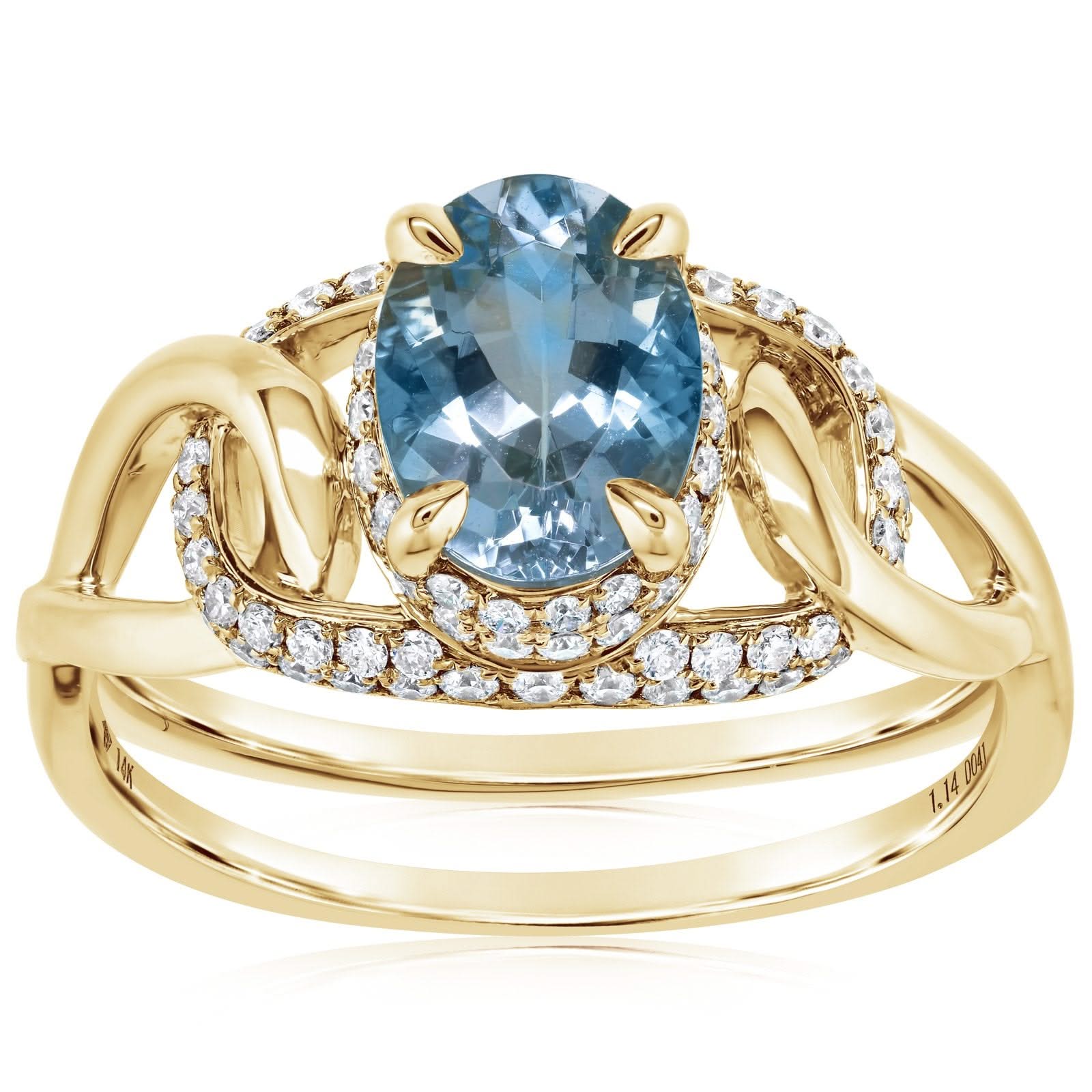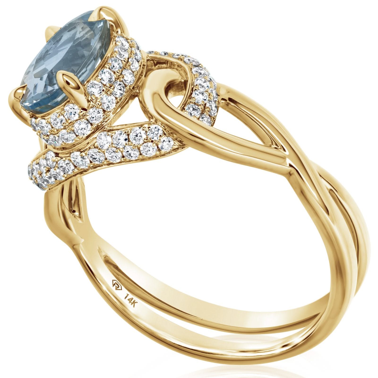 14K yellow gold aquamarine and diamond ring from the Reis-Nichols Collection The ring features one oval aquamarine weighing 1.14 ctw and round brilliant cut diamonds weighing .41 ctw. Size 7 in stock now. Special order sizing available. Pricing may vary with size.