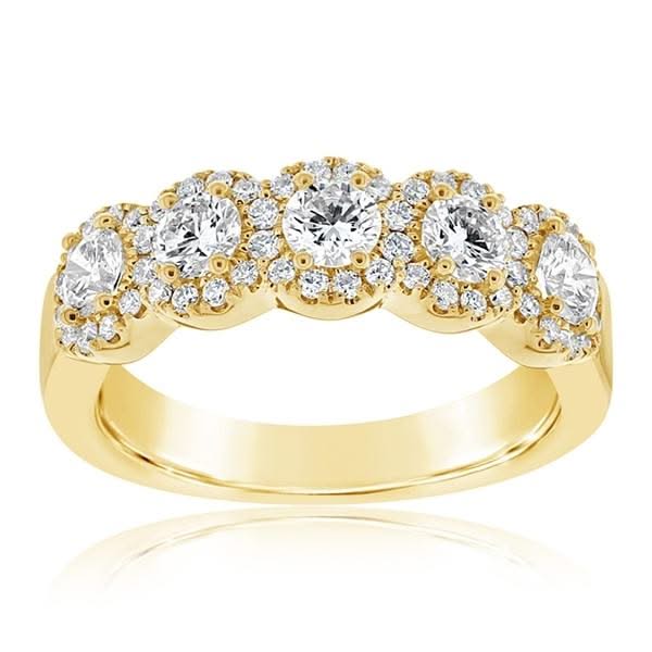 14K yellow gold halo diamond wedding band from the Reis-Nichols Collection. The band features 57 round brilliant cut diamonds weighing 1.10 ctw. Size 6.5 in stock now. Special order sizes also available. Pricing may vary with size of ring.