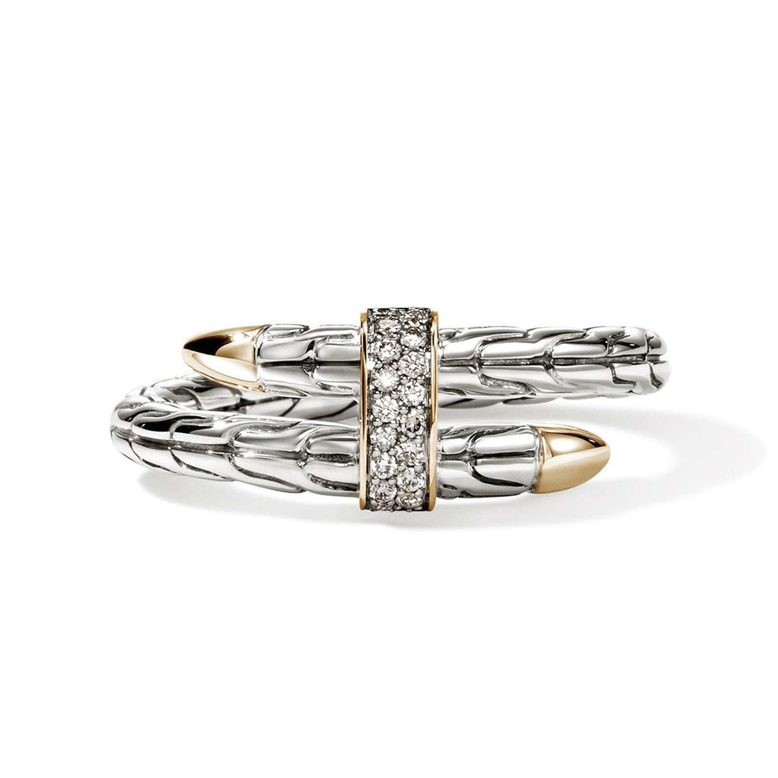 Sterling silver and 14K yellow gold Spear single wrap ring featuring 17 round brilliant cut diamonds weighing .08 ctw. Size 6 in stock now. Special order sizes also available. Designed by John Hardy.