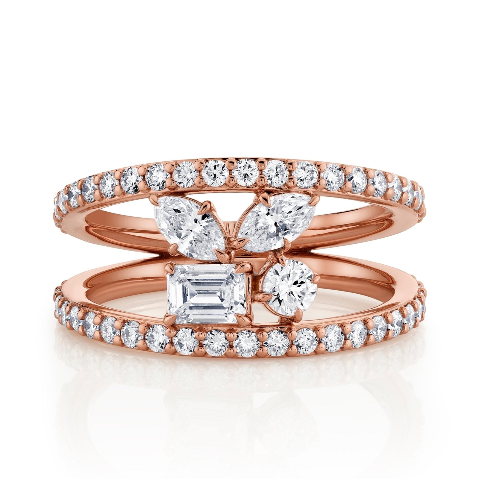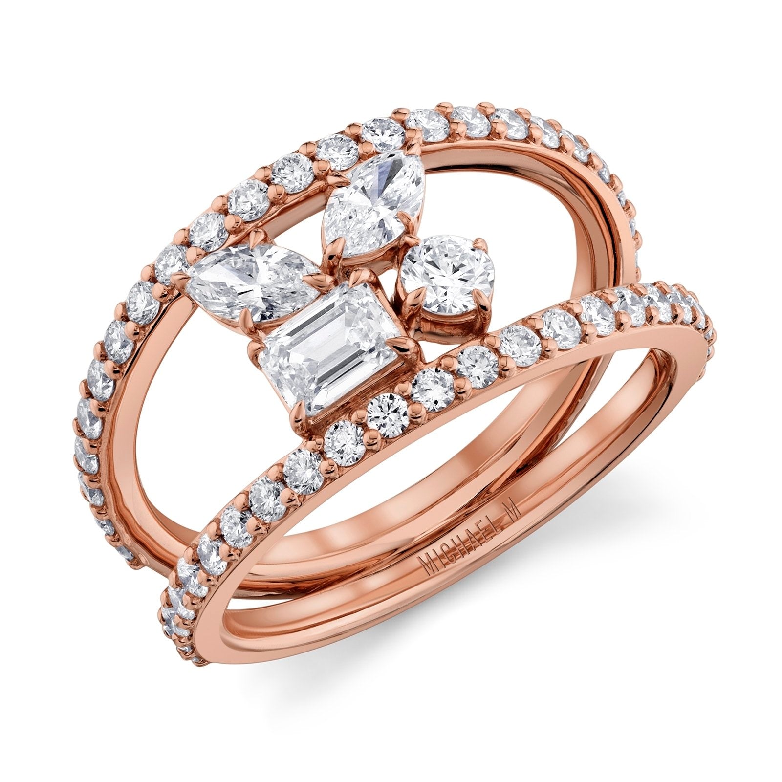 18K rose gold diamond fashion ring. The ring features one emerald cut diamond, two marquise diamonds, and round brilliant cut diamonds weighing 1.37. Designed by Michael M.