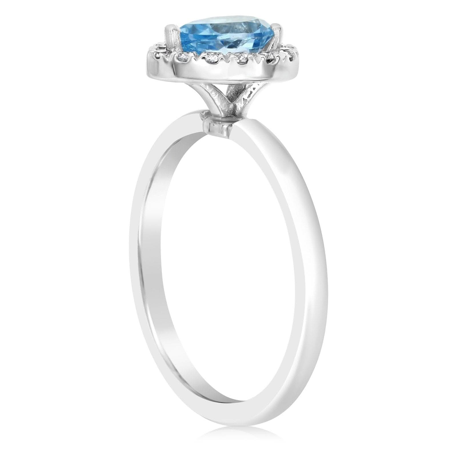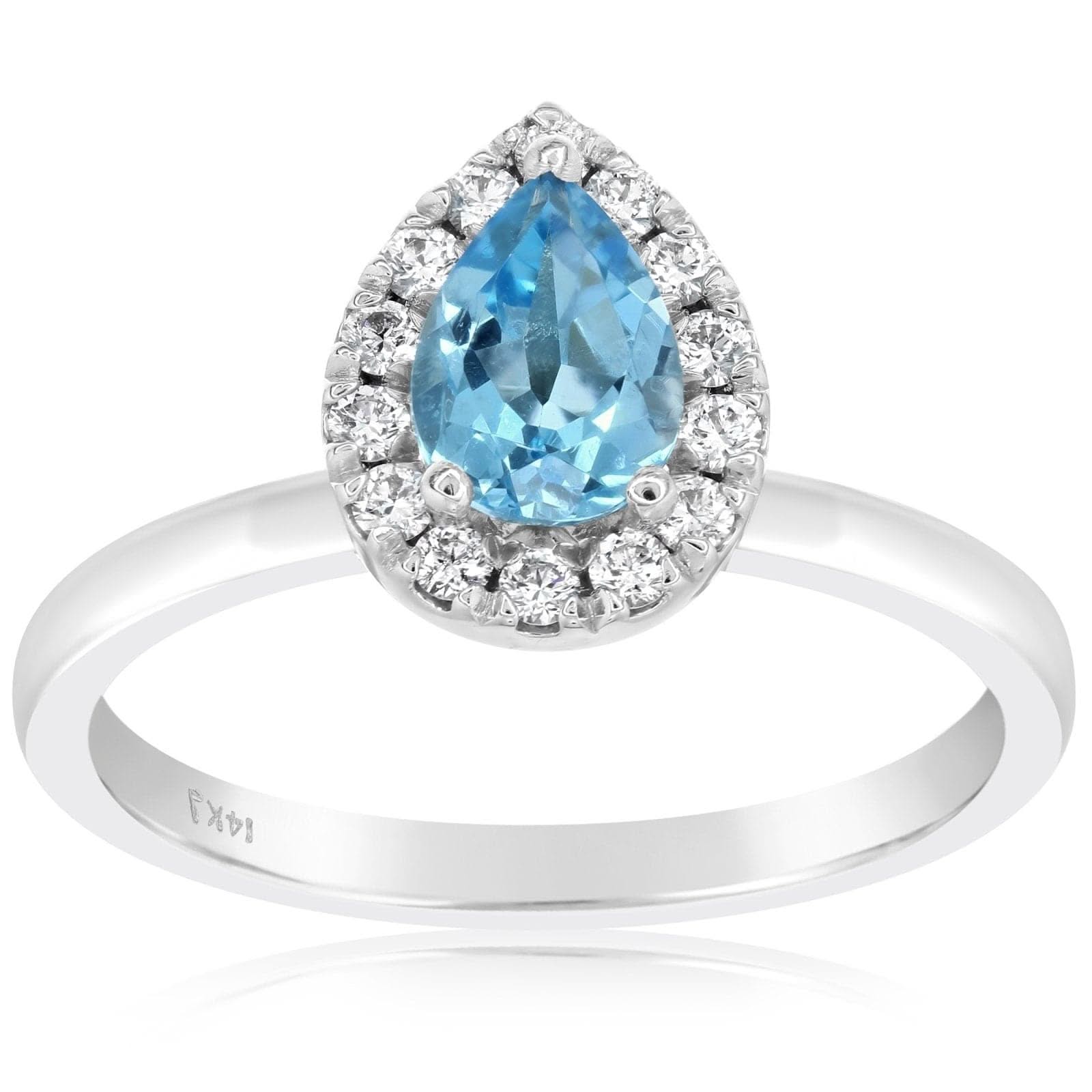 14K white gold blue topaz & diamond ring from the Reis-Nichols Collection. The ring features one pear shape blue topaz weighing .75 ct and 14 round brilliant cut diamonds weighing .20 ctw. Size 7 in stock now. Special order sizes also available.