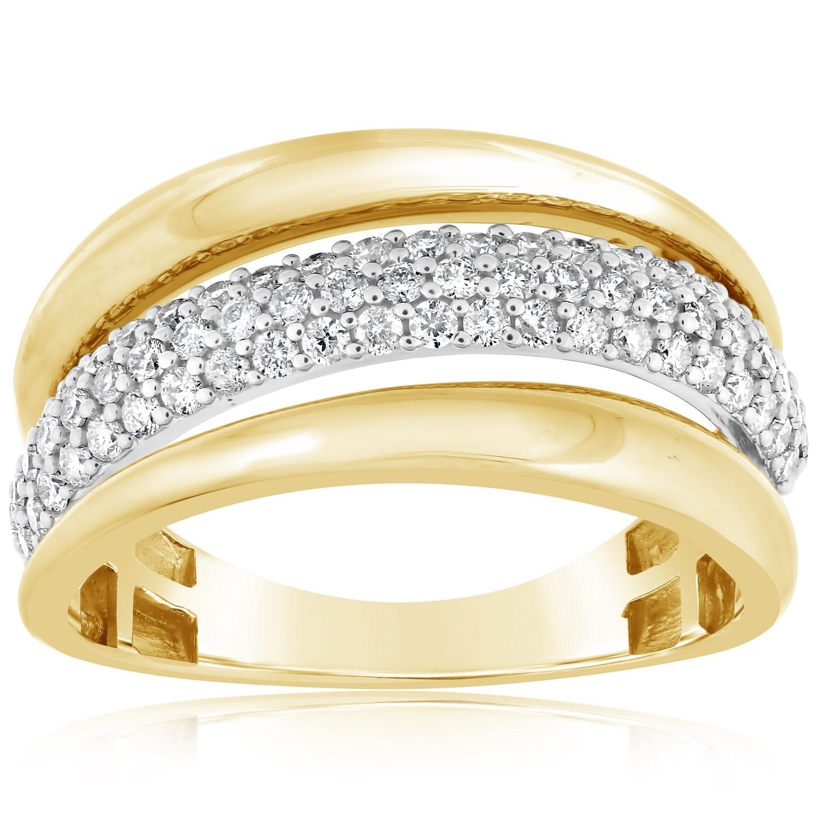 14K yellow and white gold three-row wide diamond band from the Reis-Nichols Collection. The band features round brilliant cut diamonds weighing .60 ctw. Size 7 in stock now. Special order sizes also available. Pricing may vary with size.