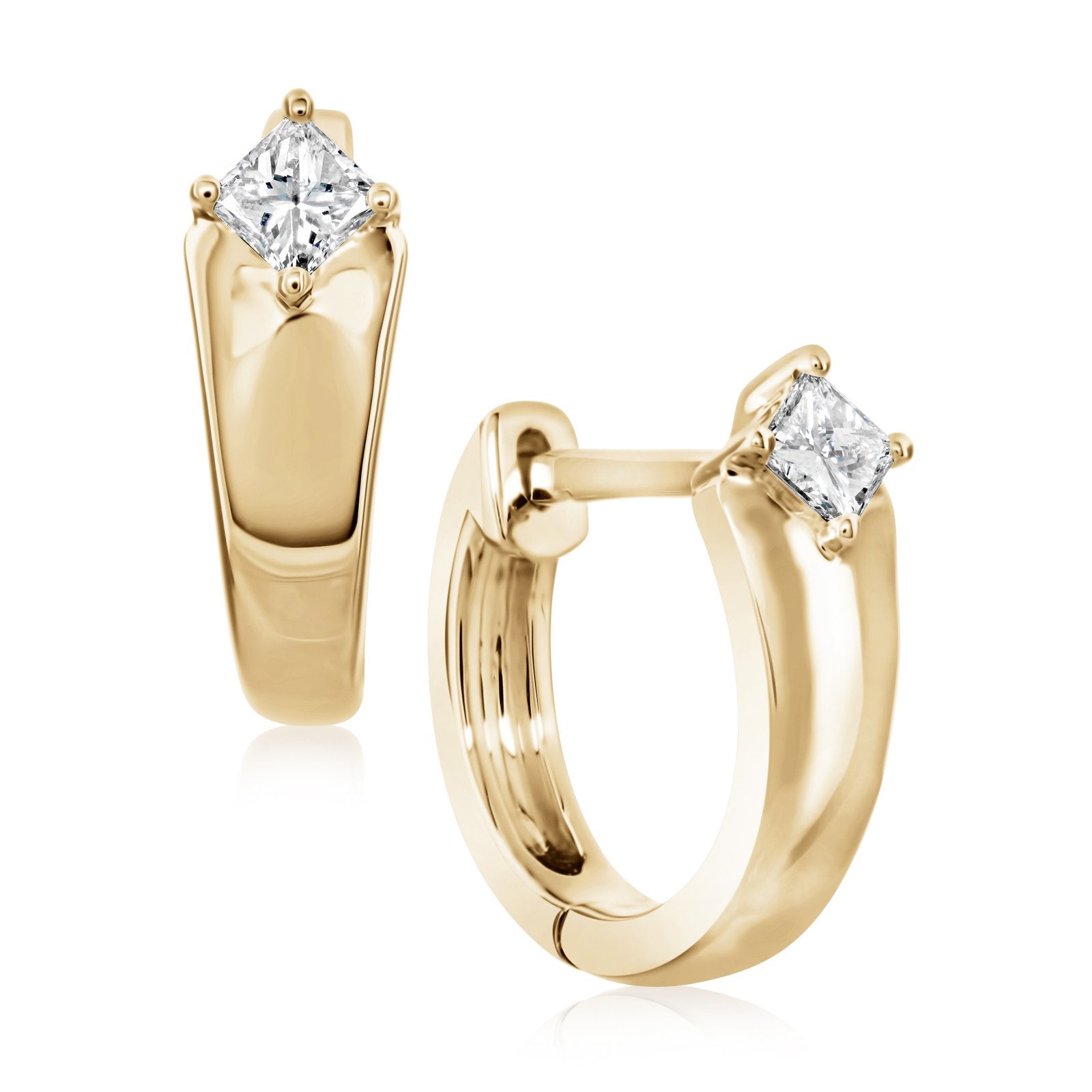 14K yellow gold diamond Kate huggie earrings. The earrings feature two princess cut diamonds weighing .19 ctw. Designed by EF Collection.