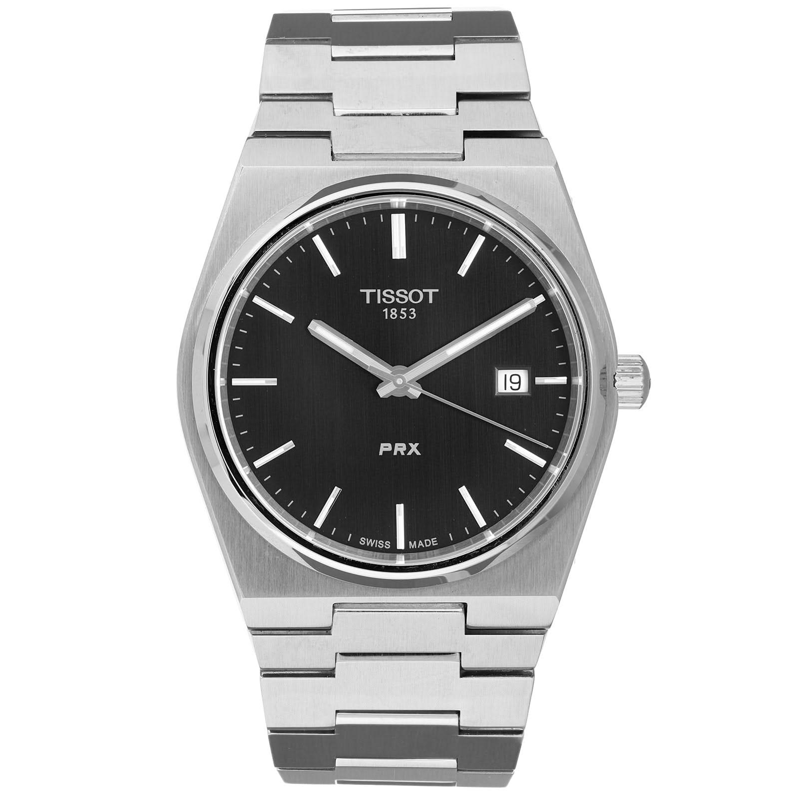 Stainless steel Tissot PRX quartz watch, circa 2020's. The watch has a black index date dial with a stainless steel bezel and a sapphire crystal. The watch case is 40mm and is attached to a stainless steel bracelet. .All estate timepieces are serviced by our Certified Master Watchmakers using genuine manufacturer parts. Each has a full two year operational warranty backed by Reis-Nichols Jewelers. Tissot T1374101105100 (model number).