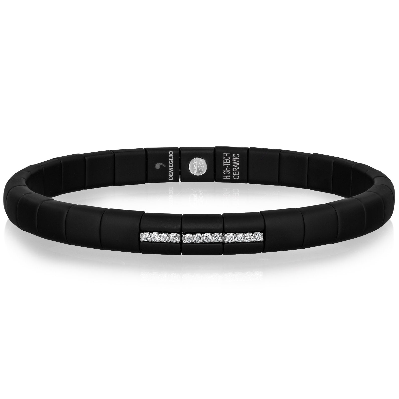 Ceramic & 18K white gold diamond stretch bracelet. The bracelet features 12 round brilliant cut diamonds weighing .25 ctw. Designed by Roberto Demeglio.