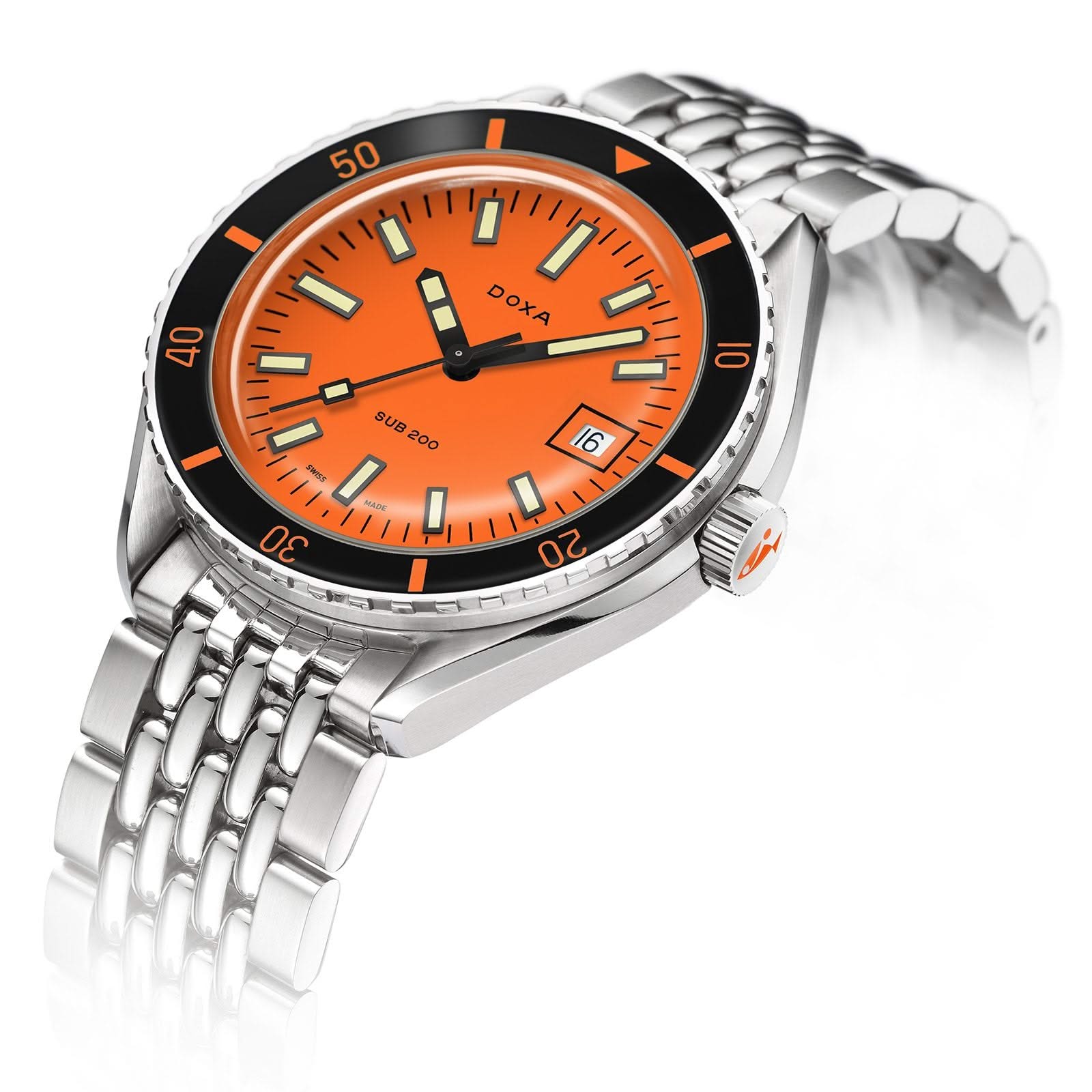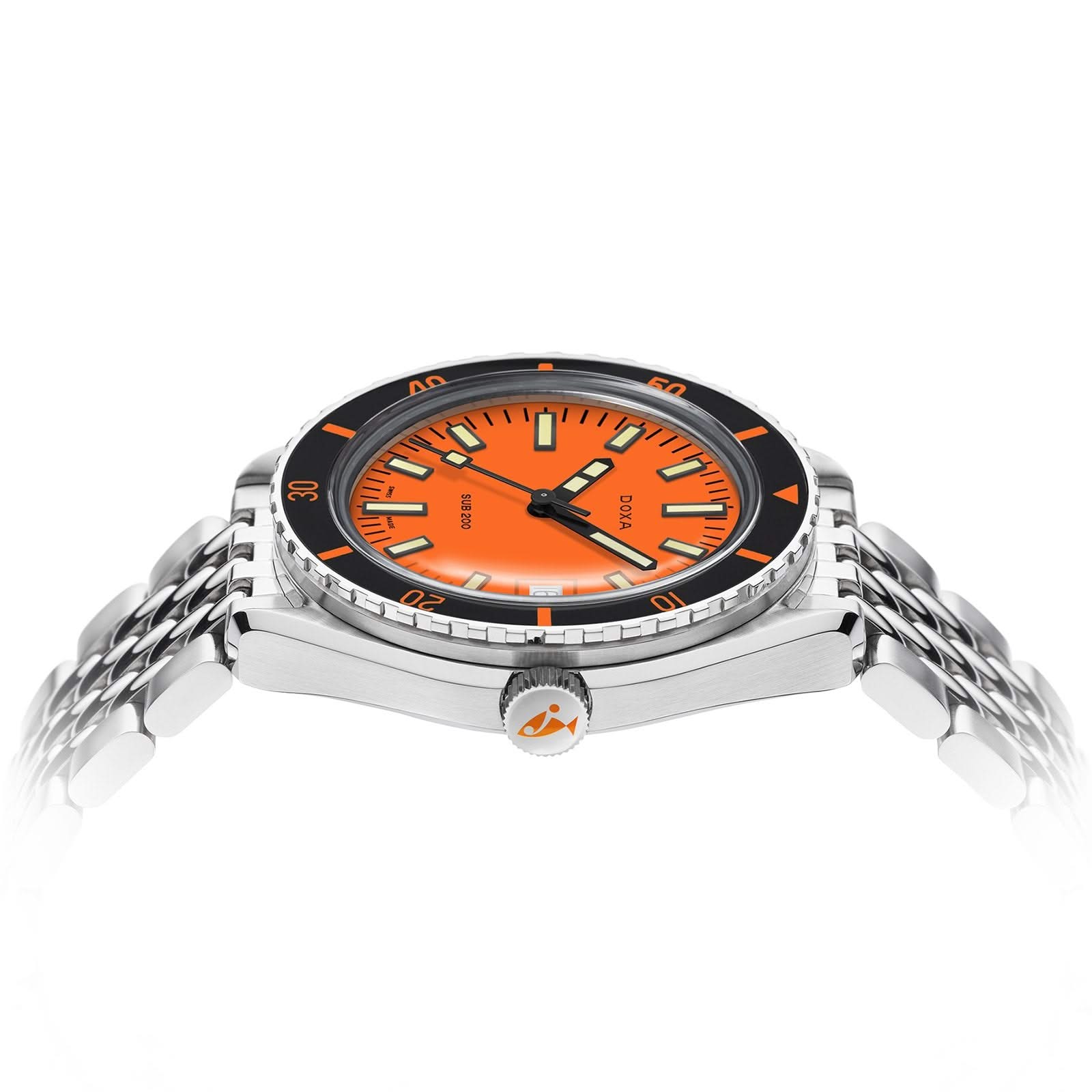 Stainless steel DOXA SUB 200 Professional automatic watch featuring an orange index date dial with a black unidirectional bezel and a stainless steel case. The watch case is 42mm and is attached to a stainless steel bracelet. Model number 799.10.351.10.