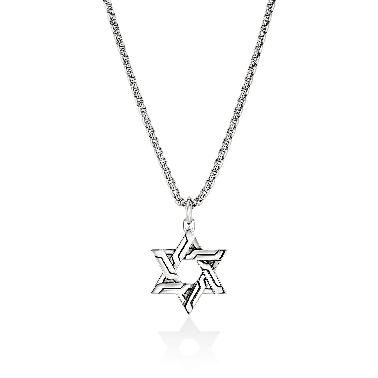 Sterling silver Icon 50 Star of David pendant on a 2.7mm box chain. The necklace measures 22" in length. Designed by John Hardy.