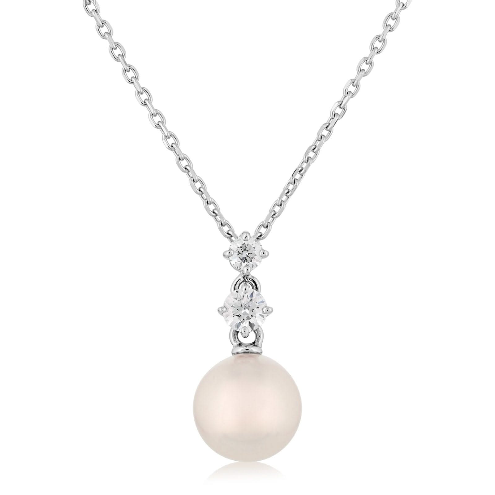 18K white gold Akoya pearl pendant featuring one 6.75MM Akoya pearl measuring and two round brilliant diamonds weighing .10ctw. The pendant is 16-18" in length. Designed by Mikimoto.