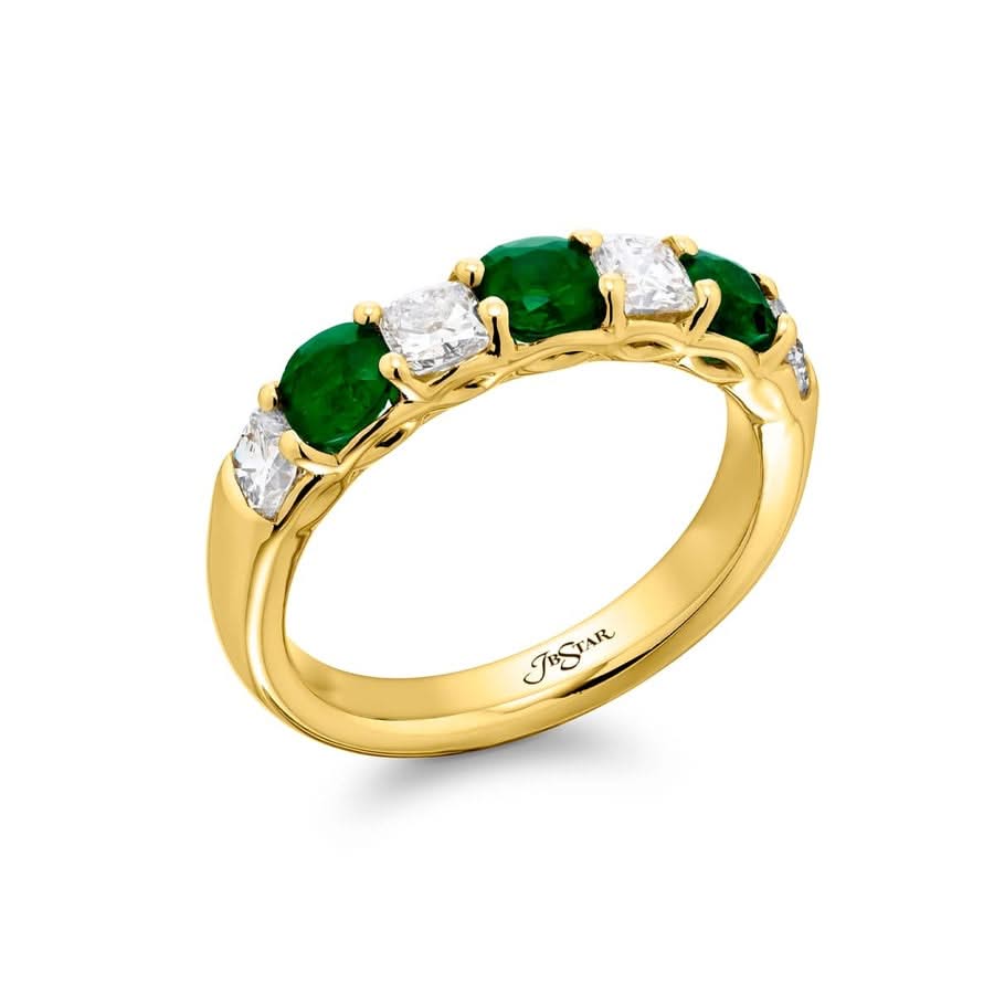 Elegance Elevated: Our classic single row Emerald and Diamond Band. These stunning cushion-cut emeralds accompany cushion-cut diamonds and are handcrafted in 18K yellow gold.