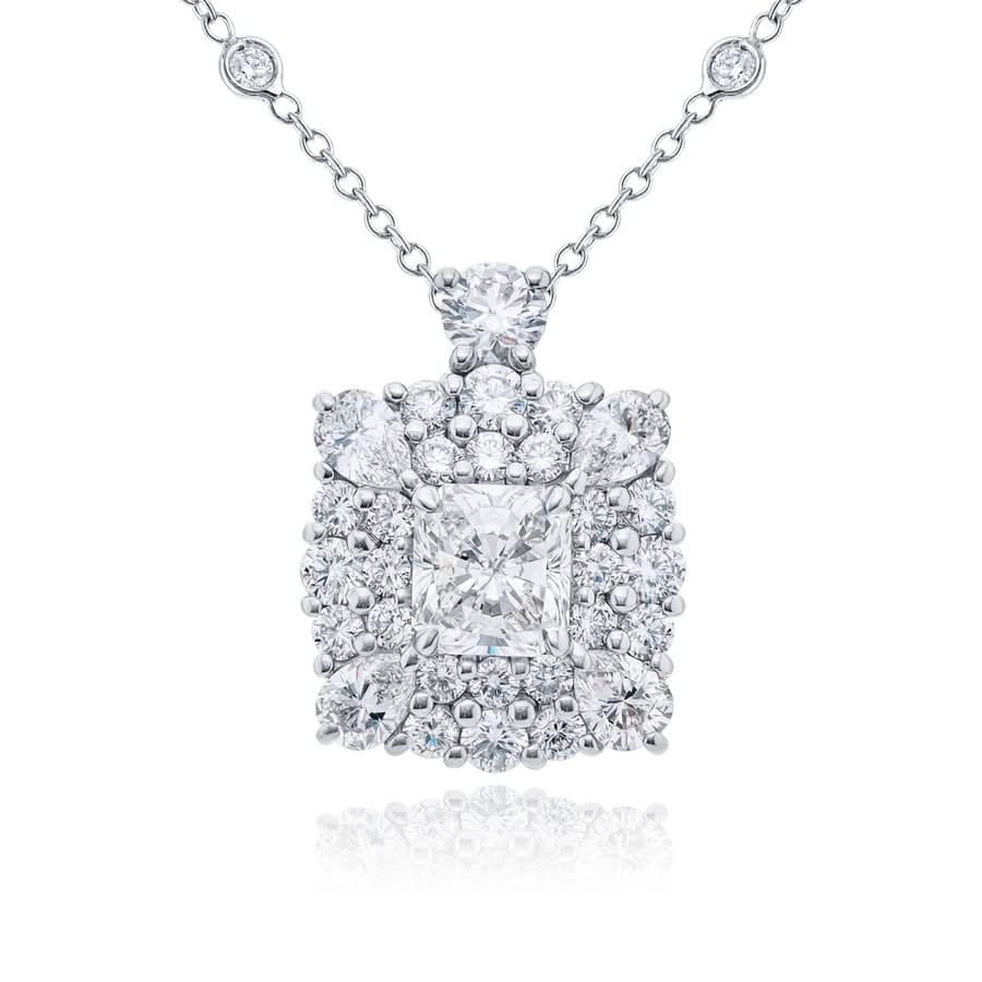 Exquisite Style: One-of-a-Kind 1.10 ct. GIA Certified Encircled Diamond Pendant Radiant-Cut Diamond with Round & Pear-Shaped Diamonds in Pure Platinum
