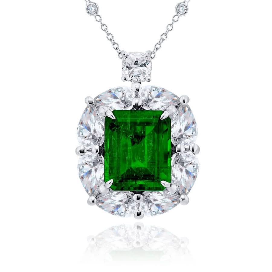 Exquisite Style: Our 3.60 ct. Certified Encircled Emerald Pendant with Pear-Shaped & Cushion-Cut Diamonds in Pure Platinum